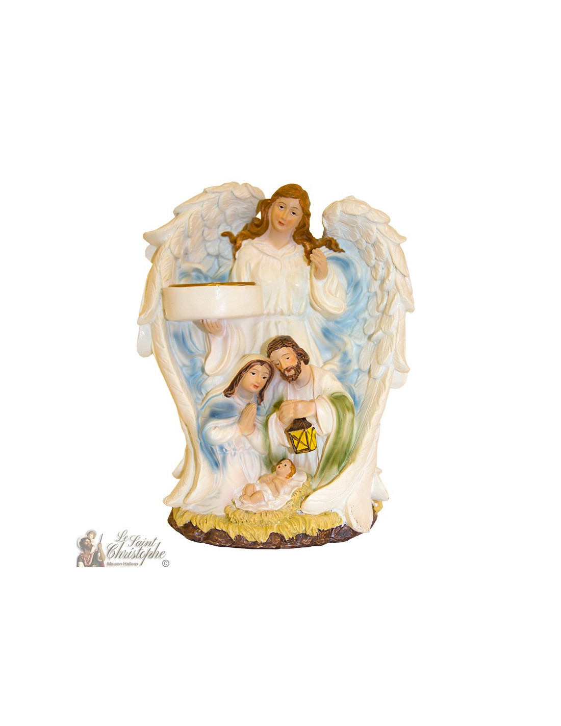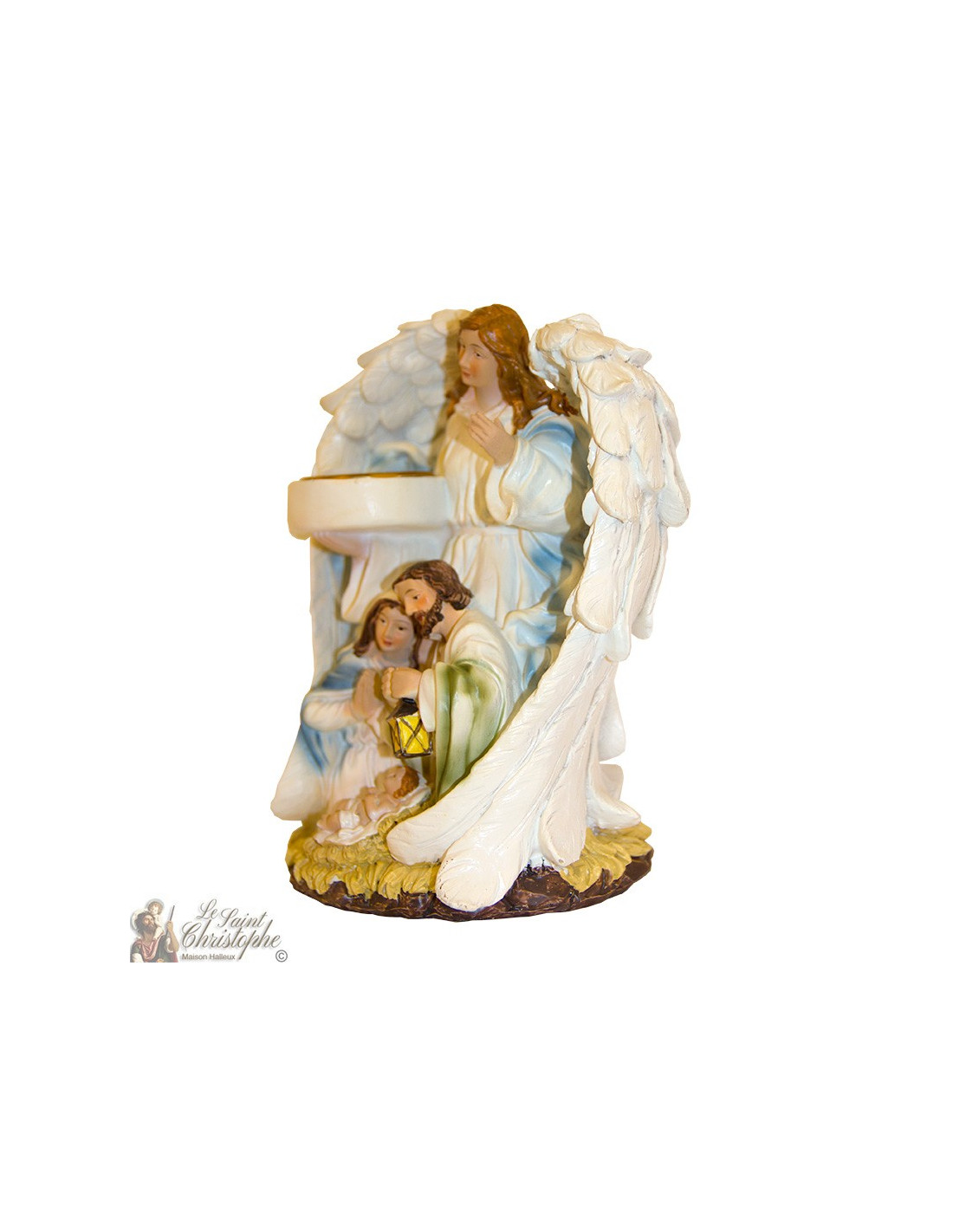Kunstwerk, geschilderd en met de hand gemaakt, dat de geboorte van Christus illustreert, omringd door Maria en Jozef en een beschermengel die een kaars draagt. Een eenvoudige en lichtgevende kerststal om een vleugje tederheid in de kerstversiering of voor het hele jaar te brengen.