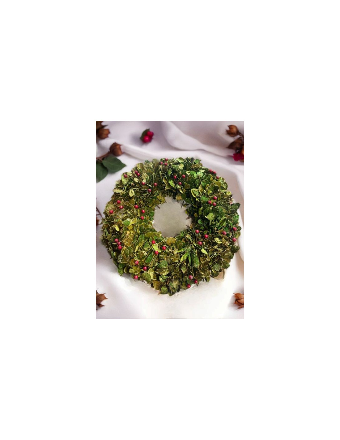 Handgemaakte kerstkrans met echte bladeren, bessen en goudstof – Ø 42,5 cm