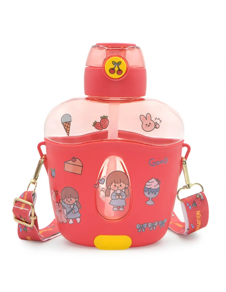 Grote waterfles van bijna 1 liter voor kinderen. Luchtdicht dankzij de dop en het geïntegreerde opvouwbare rietje. Met het rietje kun je de inhoud opdrinken zonder de fles te kantelen - een eenvoudige zuignap volstaat, dus praktisch om morsen te voorkomen! De versierde schouderriem maakt hem ideaal voor op reis en makkelijk mee te nemen. Wordt geleverd met een vel stickers.