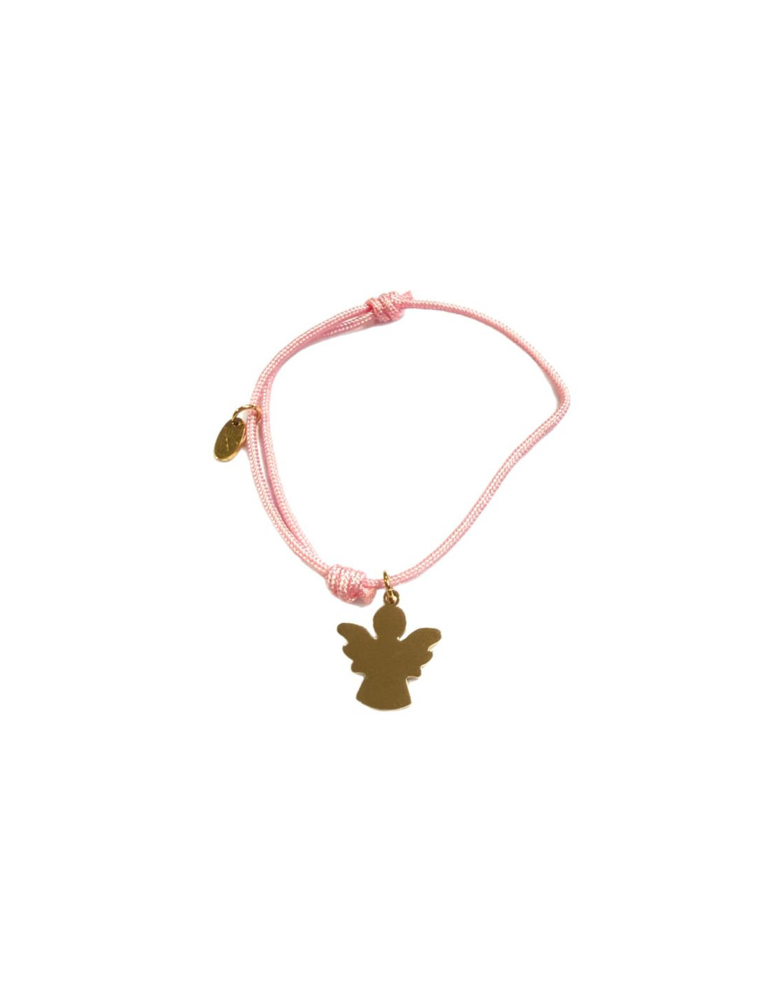 Het zachte roze koord geeft een tedere uitstraling, terwijl de gouden engelhanger bescherming, vrede en vriendelijkheid symboliseert.