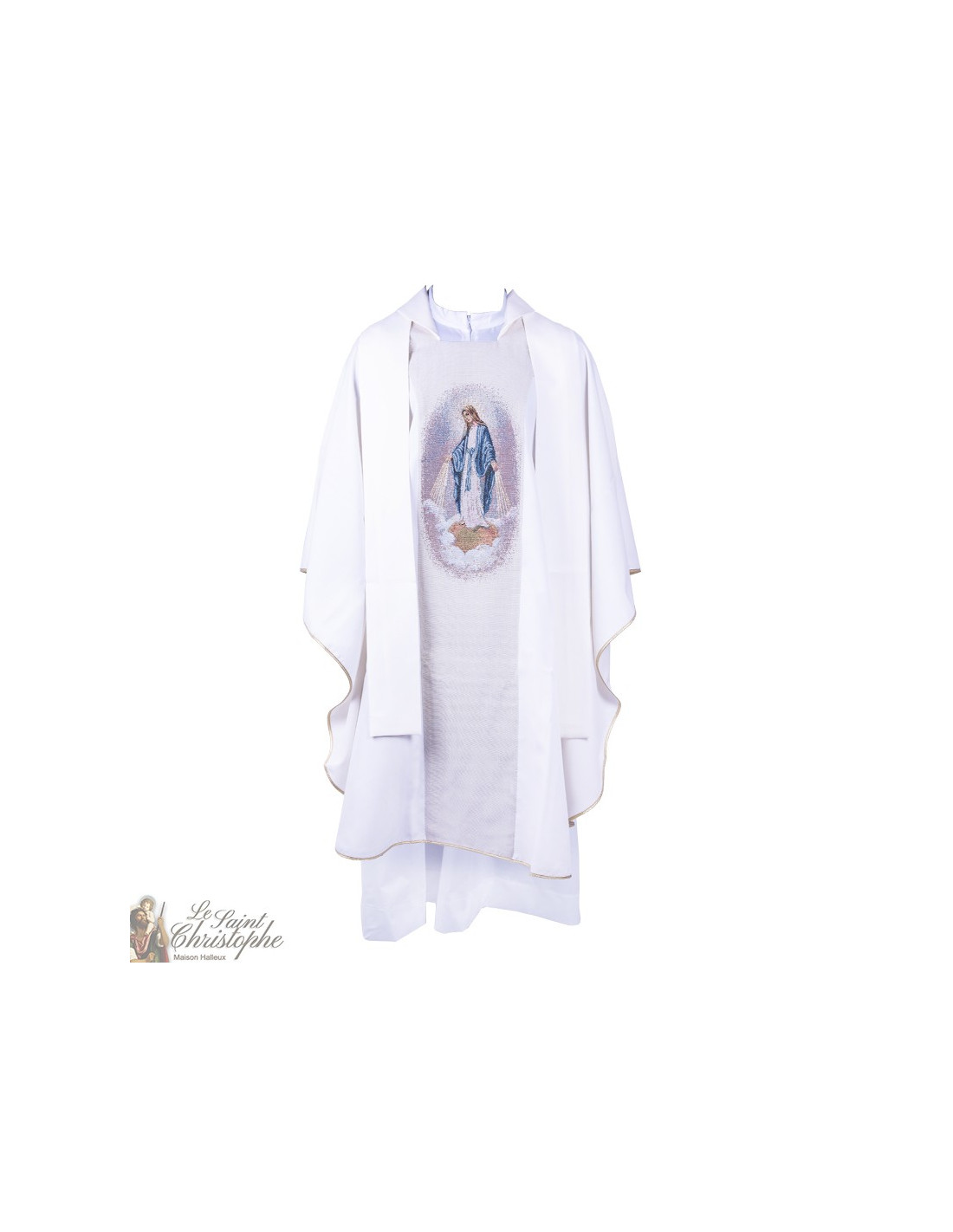 Kazuifel voor priester met scapulier van de Wonderbaarlijke Maagd in fijn handwerk. Het wandtapijt is dubbelzijdig. De rand van de stola is versierd met een gouden vlecht. Bij de stola en het kazuifel wordt een reistas geleverd.