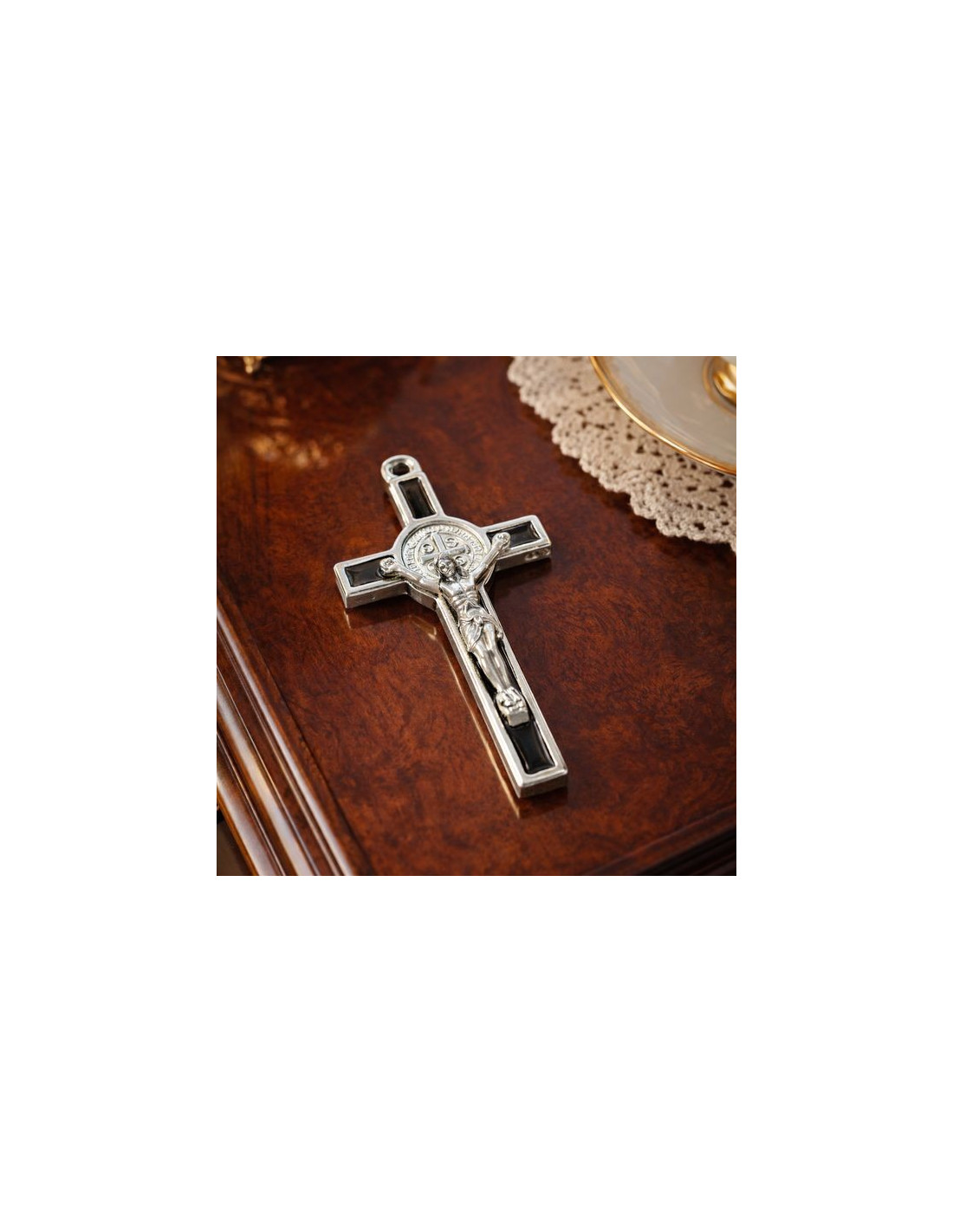 Dit verzilverde kruis met zwart email is ideaal voor het maken en monteren van rozenkransen of religieuze kettingen.