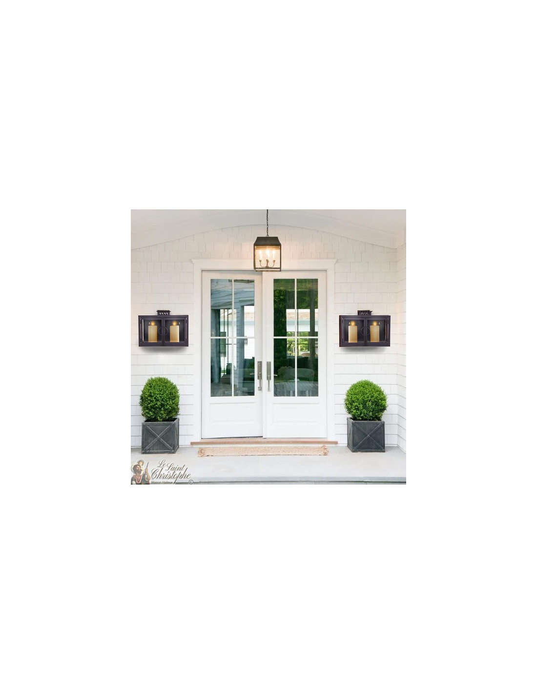 Grote rechthoekige glazen lantaarn met twee deuren en twee kandelaars.
