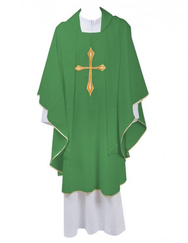 Breng een vleugje stralende plechtigheid in de gewone tijd met deze groene liturgische kazuifel, vergezeld van de bijpassende stola, geborduurd met een kruis in goud- en zilverdraad.