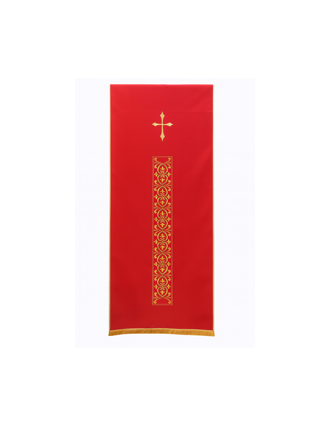 Prachtig rood lezenaardoek met een centraal kruis en een verticale band met goudgestikte biezen.