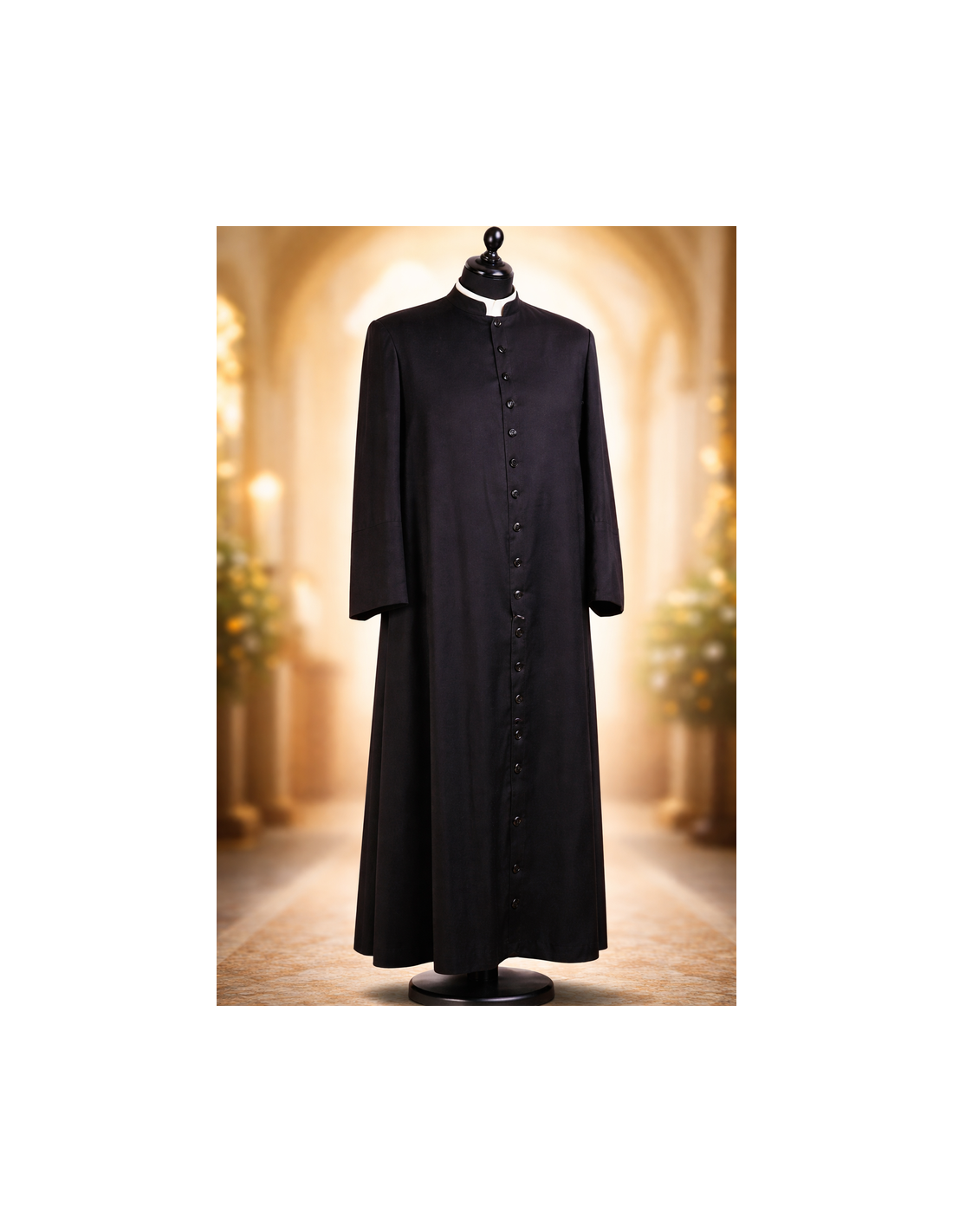 Deze zwarte soutane is een klassiek en tijdloos liturgisch gewaad, voornamelijk bedoeld voor priesters, maar ook zeer geschikt voor koren, misdienaars en religieuze gemeenschappen.