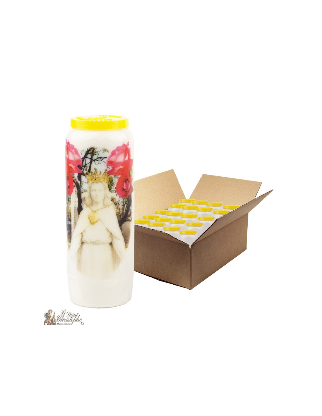 Met foto's en gebeden Heilig Hart van Mary Novena Kaarsen - 20 stuks 5430001266962 € 65,00 Witte noveenkaars met de beeltenis van het Heilig Hart van Maria en een gebed dat aan haar is opgedragen.Continu branden gedurende 9 dagen. Samengesteld uit plantaardige olie.Afmetingen: 6 x 18 cm Gewicht: 520 grKarton van 20 stuks In winkelwagen