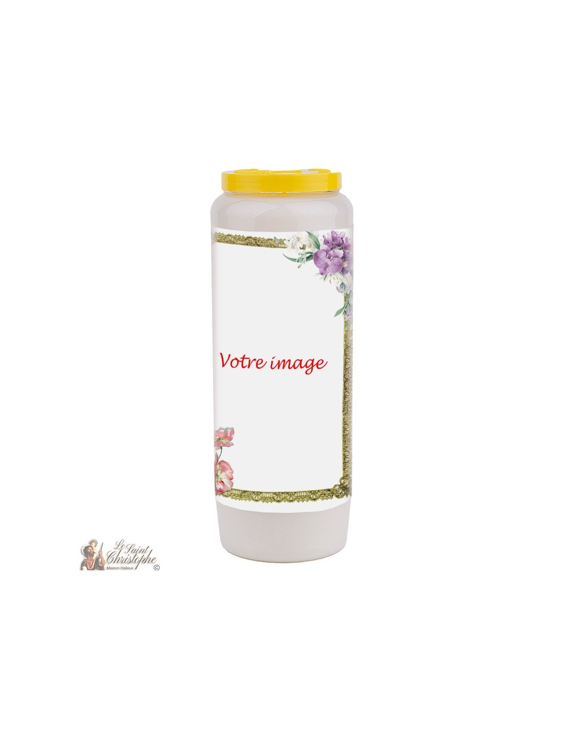 Plantaardige noveenkaars met de afbeelding naar keuze vooraan en het gebed achteraan, opgedragen aan een overleden geliefde.