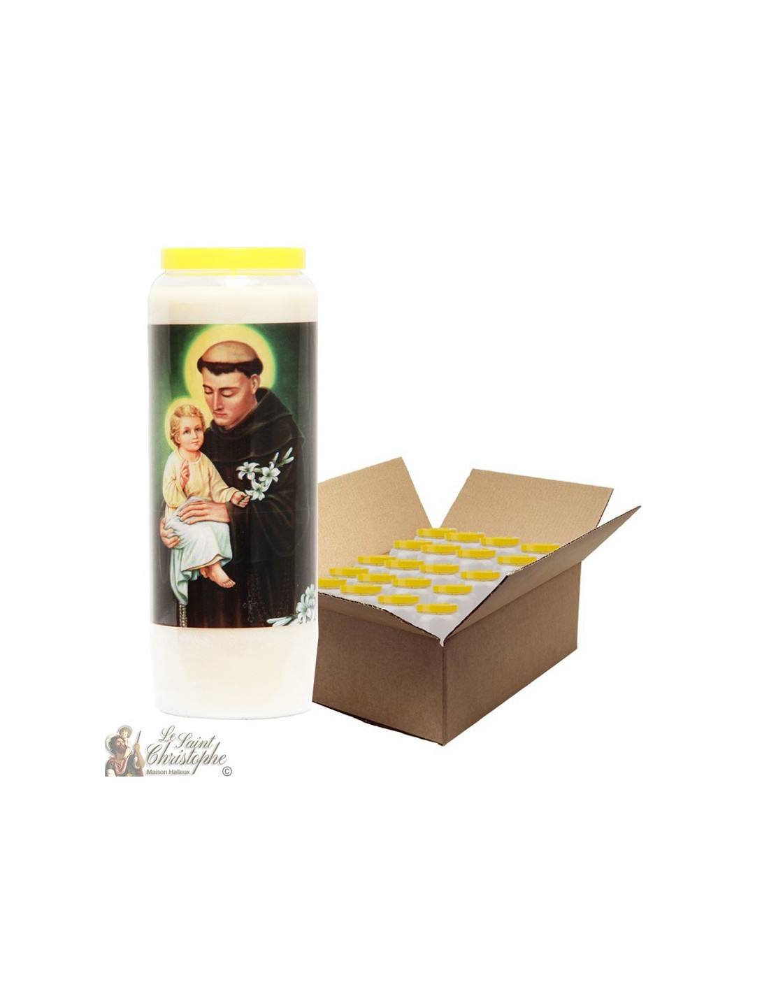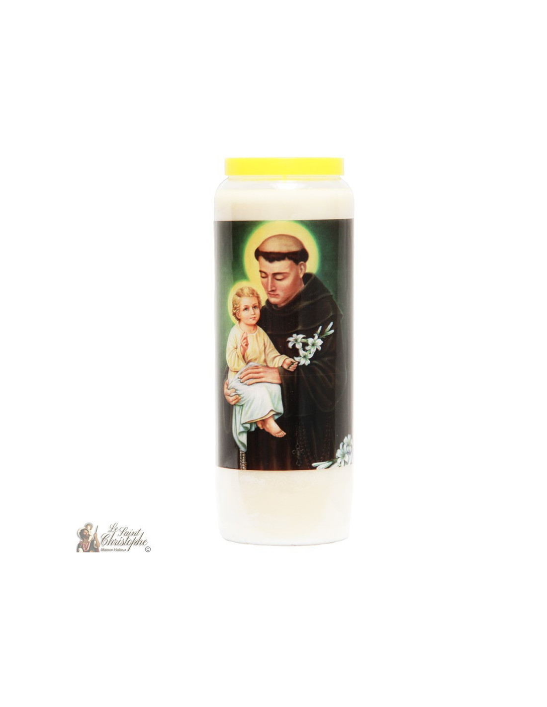 Witte noveenkaars met de beeltenis van de heilige Antonius van Padua en een gebed opgedragen aan hem.