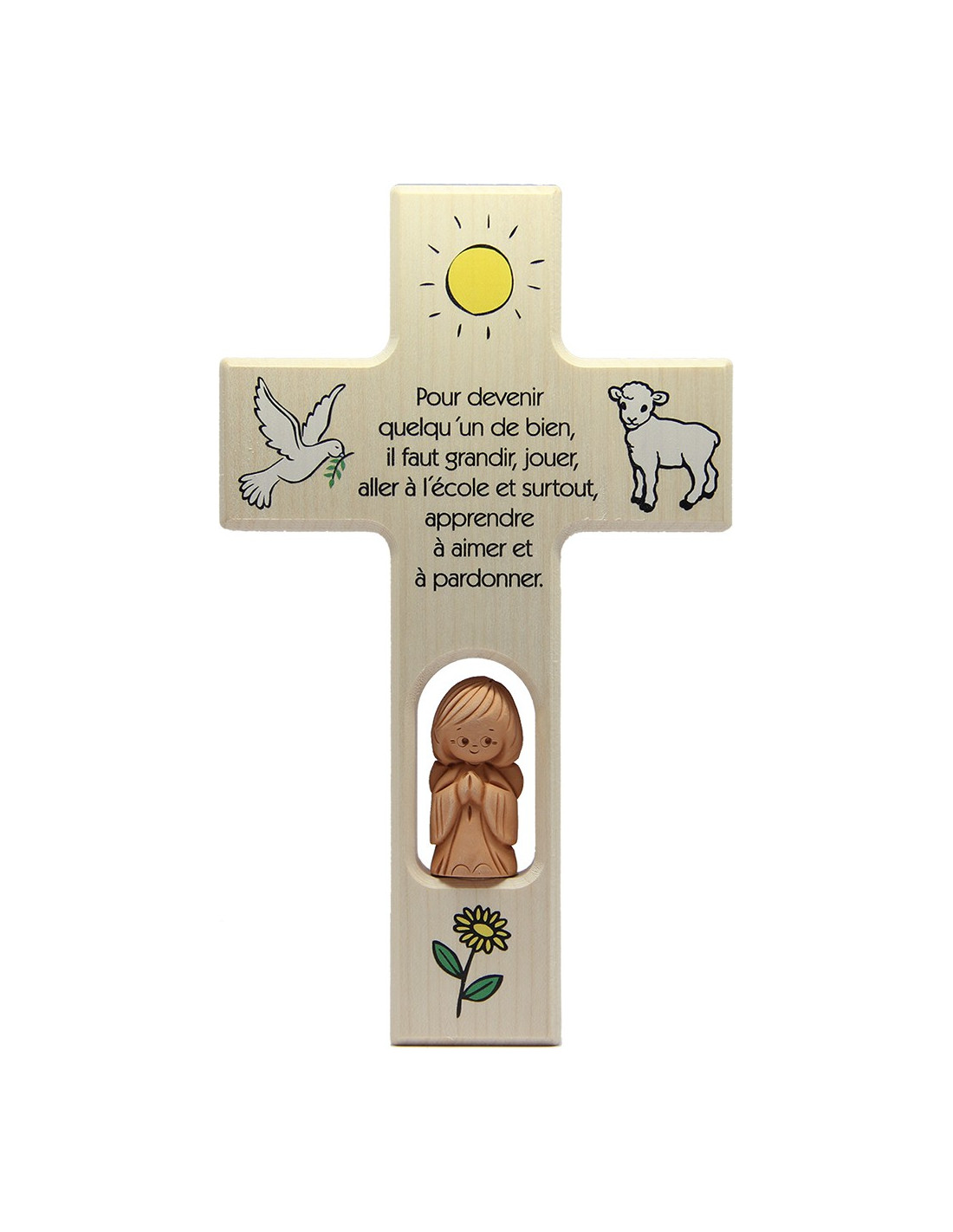 Geef een symbolisch en teder cadeau met dit licht houten wandkruis, speciaal ontworpen voor een kinderkamer. Versierd met mooie, kleurrijke ontwerpen en een kleine terracotta beschermengel, straalt het zowel zachtheid als geloof uit. In het midden van het kruis staat een Franse tekst die herinnert aan het belang van liefde, vergeving en de essentiële waarden van het leven: "Om een goed mens te worden, moet je opgroeien, spelen, naar school gaan en vooral leren liefhebben en vergeven." Dit christelijke kruis is ideaal als doop-, communie- of geboortegeschenk en zal je kind begeleiden tijdens zijn of haar ontwikkeling. Door het harmonieuze formaat is het gemakkelijk aan de muur te hangen en vormt het een troostende aanwezigheid in de slaapkamer.