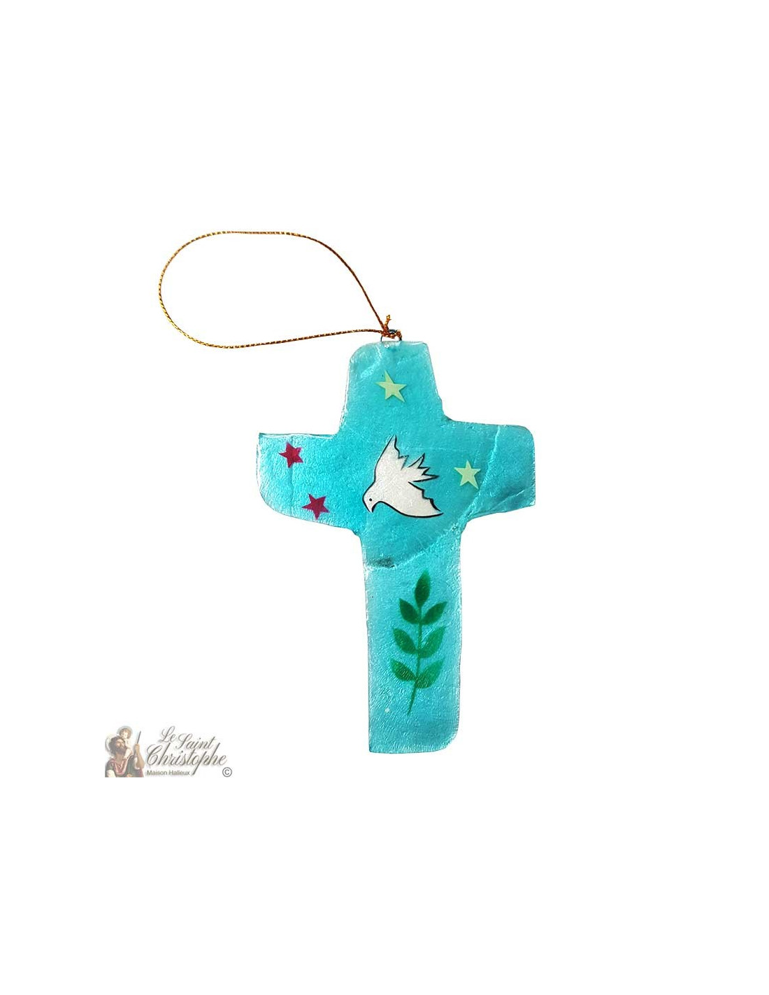 Fijn, handgeschilderd parelmoeren muurkruis. Een duif, sterren en een olijftak zijn gestileerd op een effen turkooisblauwe achtergrond. Het parelmoer geeft een intensiteit en levendigheid aan de kleur die zeer aangenaam is voor het oog. Het kruis is aan beide zijden beschilderd.