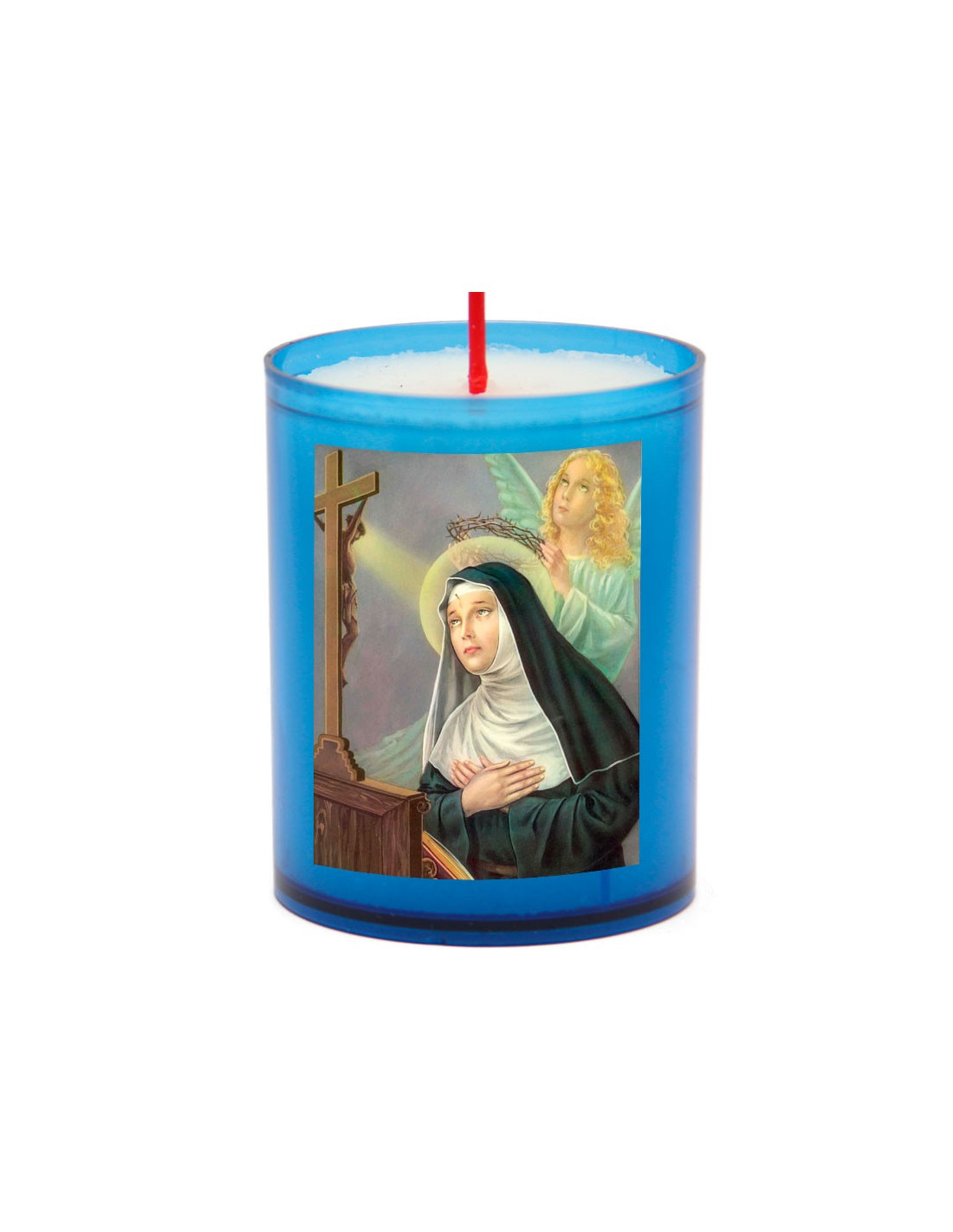 Blauwe nachtkaarsjes met de beeltenis van de heilige Rita. Verkocht in verpakkingen van 10.