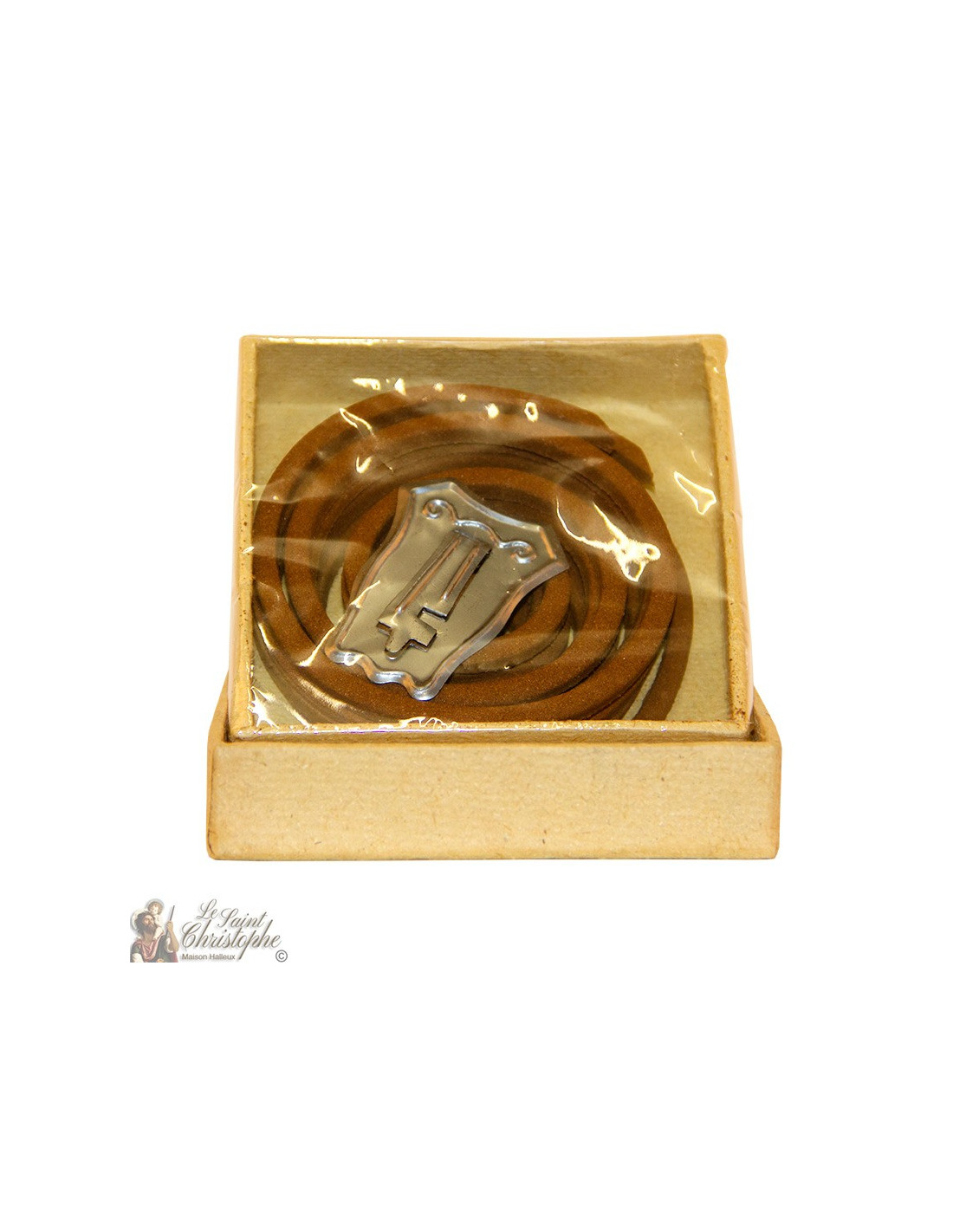Om uw spiraalvormige wierook te gebruiken, neemt u de houder en tilt u het metalen lipje op. Plaats hem op een stabiele ondergrond en druk het midden van de spiraal, waar de holte zich bevindt, op het metalen lipje. Steek het uiteinde van de spiraal aan.