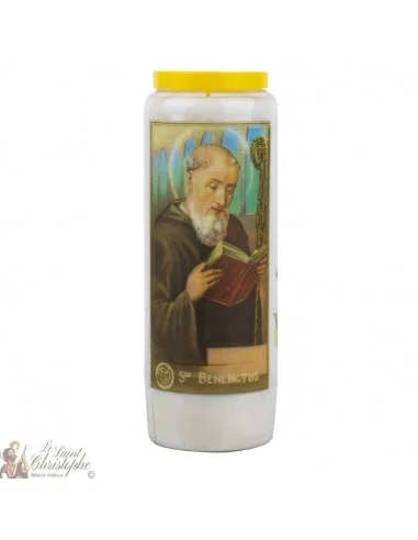 Witte noveenkaars met de beeltenis van de heilige Benedictus en een gebed opgedragen aan hem.