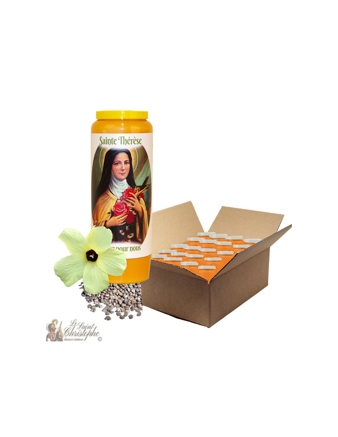 Plantaardige noveenkaars geparfumeerd met muskus met afbeelding van de heilige Theresia van Lisieux en gebed op de rug in de taal van uw keuze. - Een doos bevat 20 Novena-kaarsen.