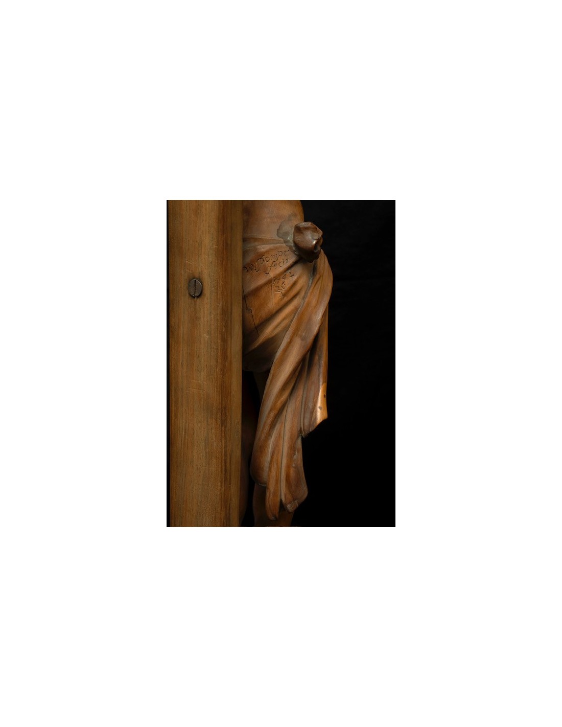 Zeldzame antieke houten sculptuur met de voorstelling van Christus aan het kruis, toegeschreven aan de Antwerpse beeldhouwer Walther Pompe (1703–1777). Het werk onderscheidt zich door de hoge kwaliteit van uitvoering en de sterke expressieve kracht van de figuur.