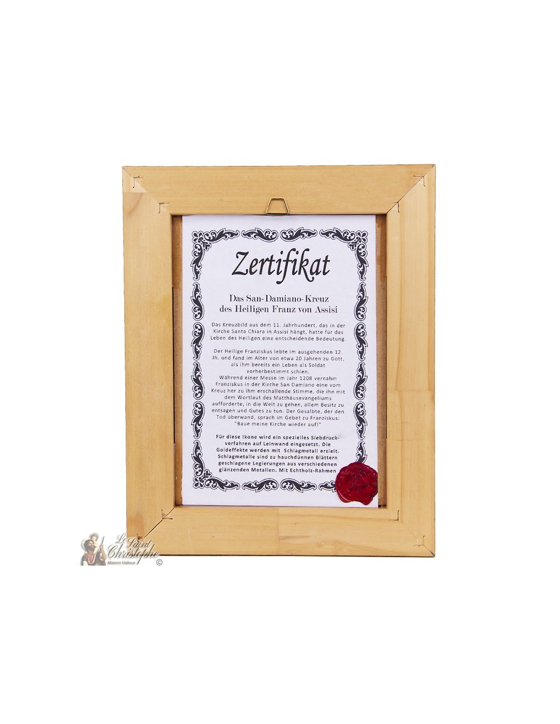 Icoon van het kruis van Sint-Damiaan, met antiek kader en garantiecertificaat op de achterkant.