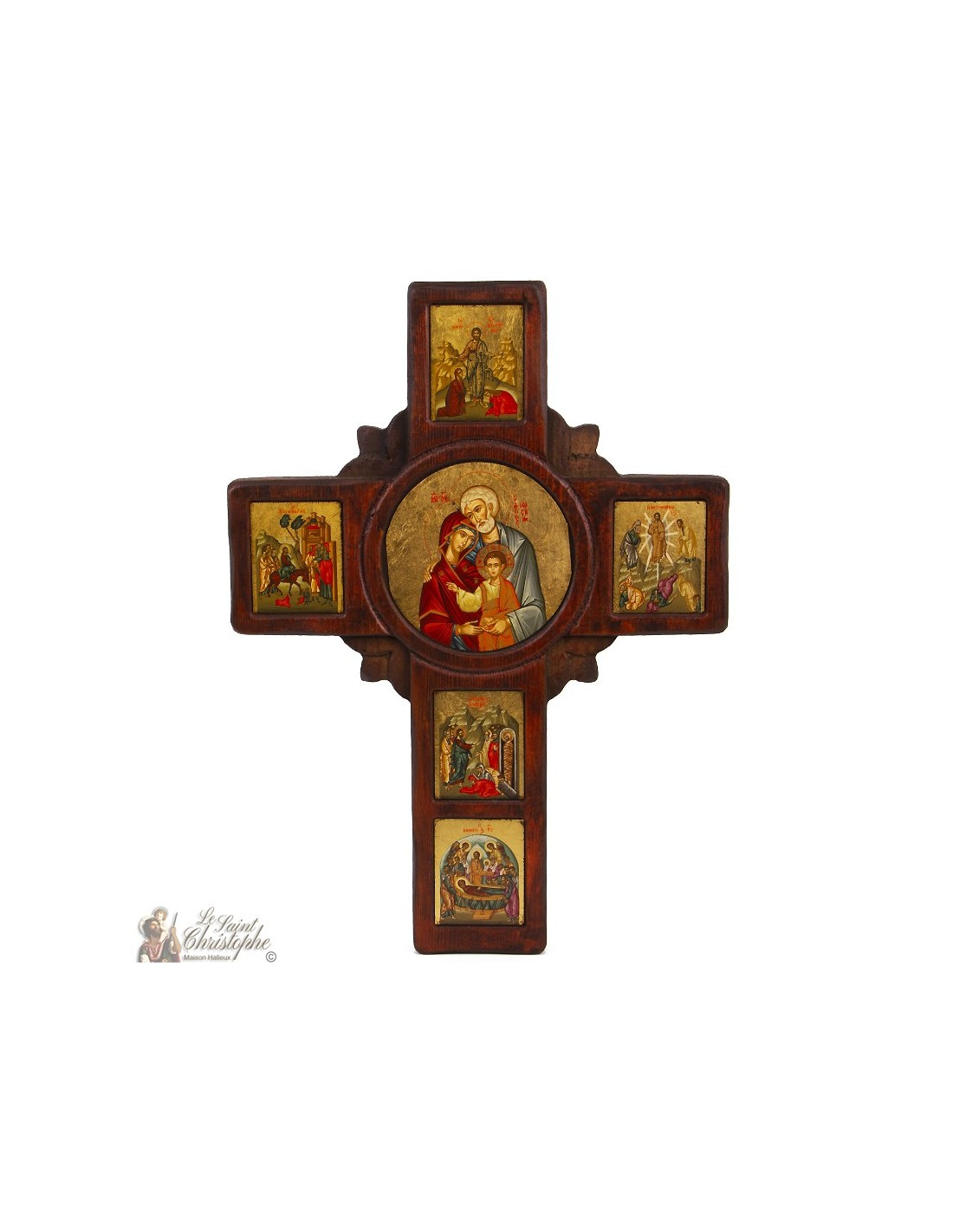 Deze houten icoon in de vorm van een kruis toont in het midden de Heilige Familie, omringd door Bijbelse taferelen. Het verouderde frame en de handgemaakte afwerking maken het een kwalitatief, spiritueel en decoratief stuk.