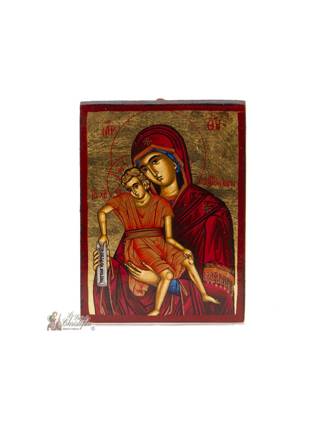 Dit orthodoxe icoon stelt de Maagd van de Waardigheid voor, ook wel "Axion Estin" genoemd. Maria draagt in een plechtige houding het zegenende Kind Jezus, dat wijsheid en verlossing symboliseert. Omgeven door een achtergrond van bladgoud stralen beide goddelijk licht uit. Deze icoon van 9 x 12 cm, gemaakt op hout, is een getrouwe weergave van de Byzantijnse stijl. Het is ideaal voor een gebedshoekje of als spiritueel geschenk.