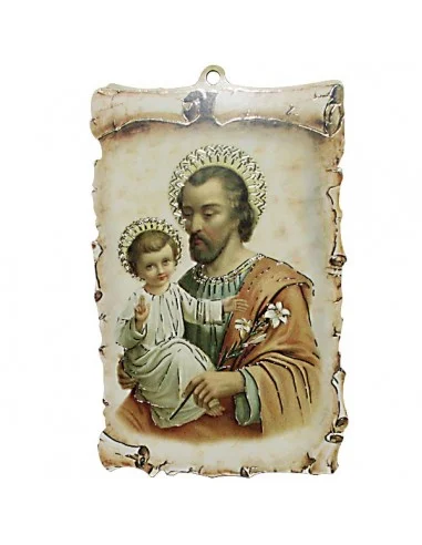 Sint Jozef, voedstervader van Christus en beschermer van de Heilige Familie, is een centrale figuur van zachtheid, innerlijke kracht en geloof. Op deze afbeelding wordt hij afgebeeld terwijl hij het Kind Jezus met vaderlijke tederheid vasthoudt en een lelie in zijn hand heeft, symbool van zuiverheid. Deze plaquette in de vorm van een perkament doet denken aan oude religieuze afbeeldingen, maar past tegelijkertijd goed in een eigentijds interieur. Een mooie manier om vrede en zegen in uw dagelijks leven te brengen.