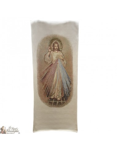 Wandtapijt geborduurd met het beeld van de Barmhartige Christus, volgens het beeld van de Heilige Zuster Faustina, wandelend op een geplaveide vloer, gehalodeerd met licht en met haar hart spreidend haar medelevende licht. Het is prachtig afgewerkt en handgemaakt in de stijl van de Brugse wandtapijten. De achterkant van het tapijt is ook geweven, zodat de achterkant van de naden niet zichtbaar is en plaats maakt voor een effen crèmekleurige achtergrond.