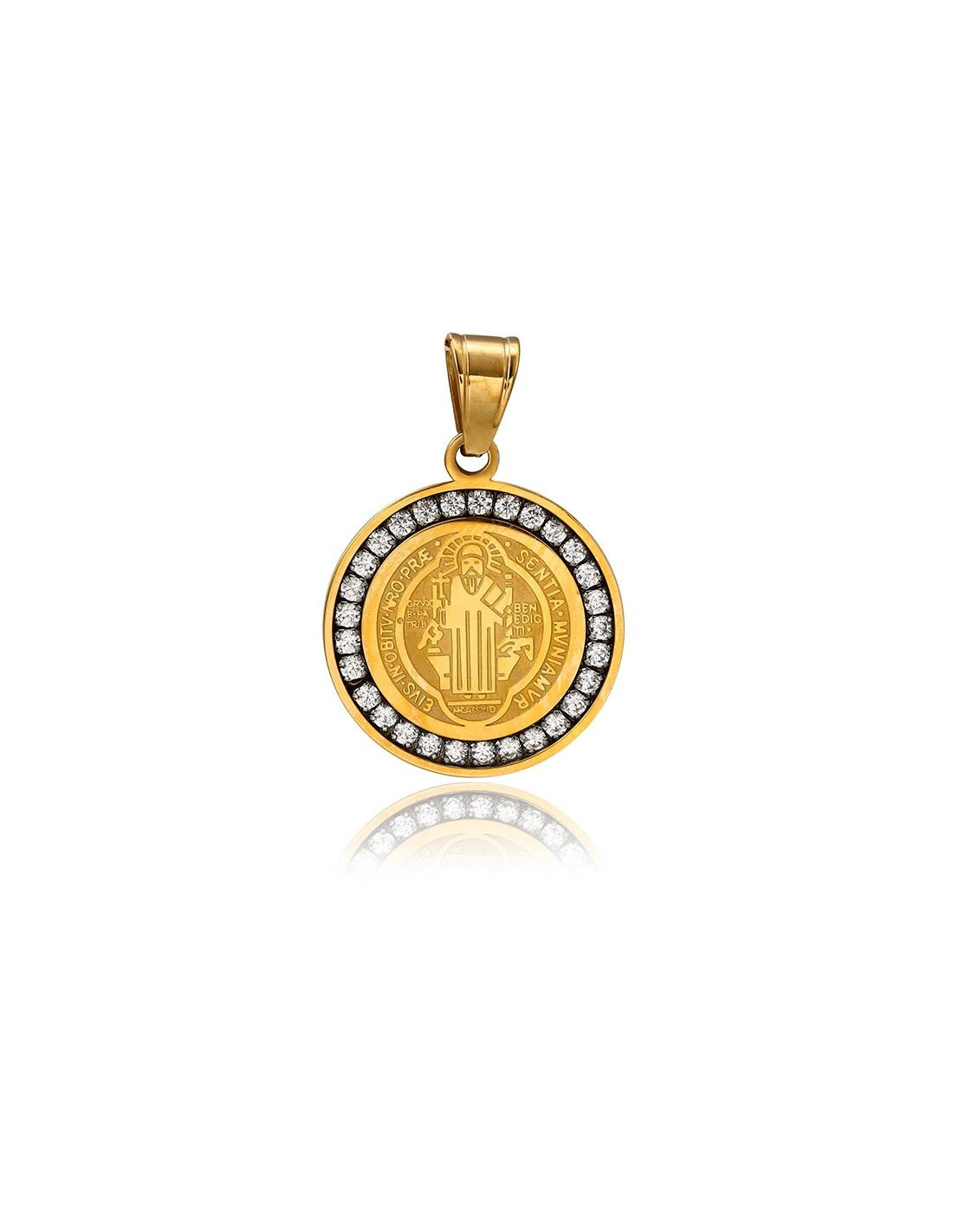 Medaille van Sint Benedictus van roestvrij staal, op de voorkant ingelegd met synthetische kristallen. De figuur van Sint Benedictus is op een modernere manier weergegeven. Deze medaille is een zeer sterk symbool van bescherming tegen het kwaad.