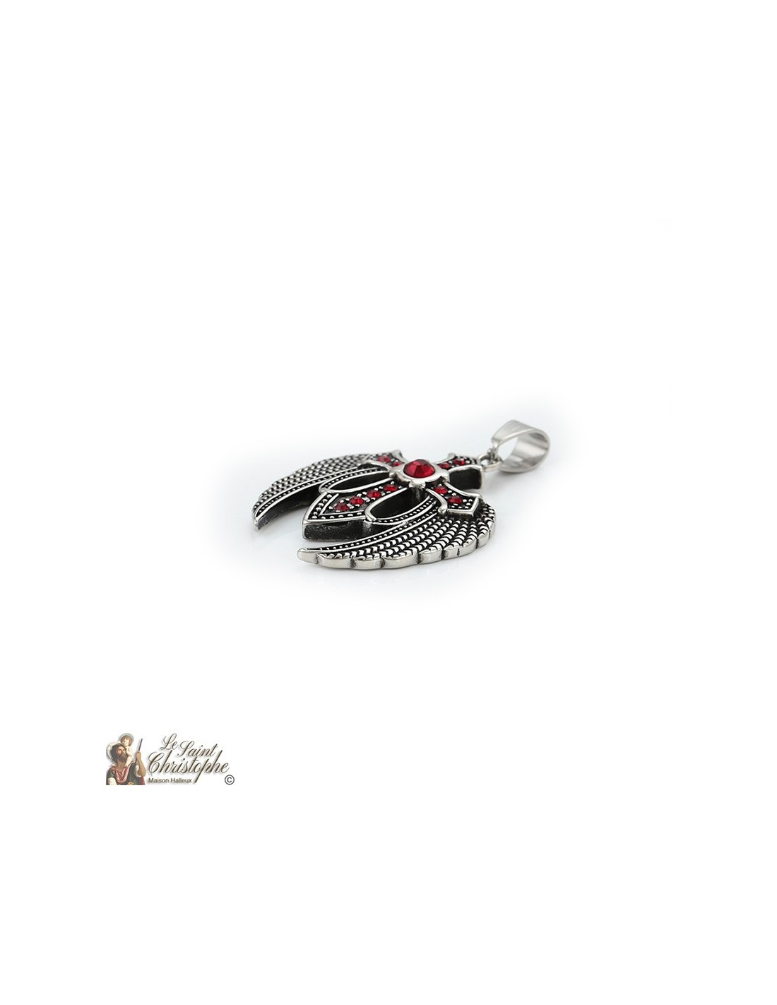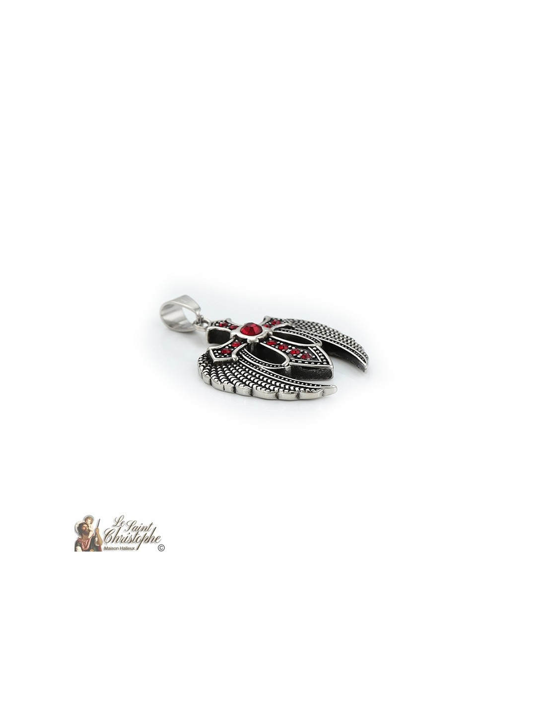 Roestvrij stalen hanger met gevleugeld kruis, ingelegd met granaatrode kristallen. Met een donkerder vernis in de holtes van de hanger is de zilveren kant van de hanger helderder en briljanter, waardoor ook de kristallen in het kruis beter uitkomen. Het centrale kristal is imposanter en de zetting is volledig zilverkleurig.