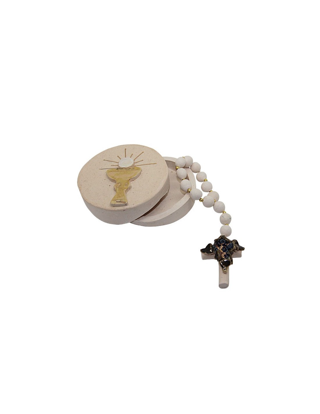 Doos en tien van een rozenkrans volledig met de hand gemaakt in terracotta. Op het ronde doosje staat het symbool van de eucharistie: een gouden kelk met daarop de hostie, in een natuurlijke lichte terracotta kleur. Binnenin is de tienpuntige rozenkrans in lichte terracotta versierd met blauwe en gouden rozen en bladeren.