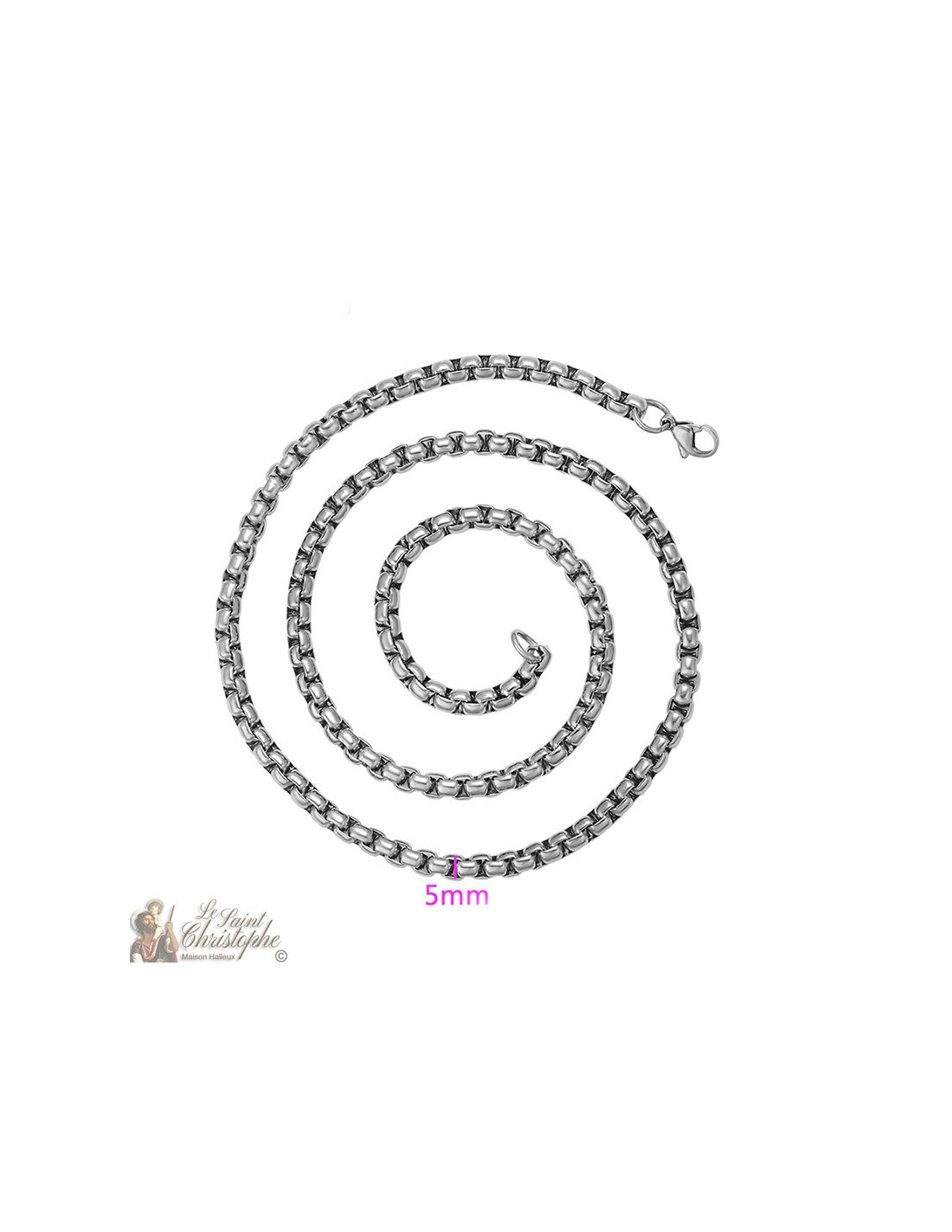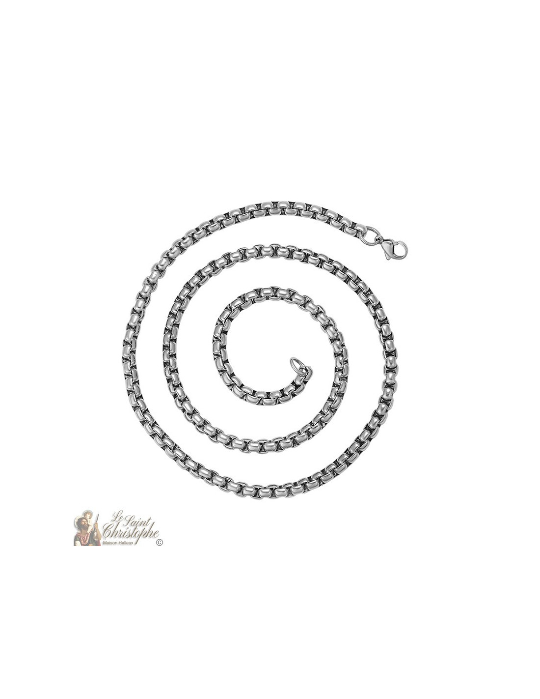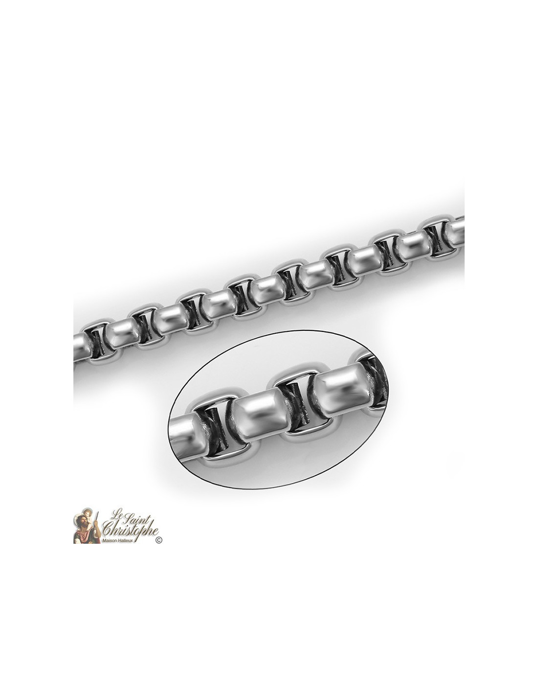 Roestvrij stalen ketting, glanzend zilver, met dikke schakels die iets vierkant zijn voor een moderne stijl.
