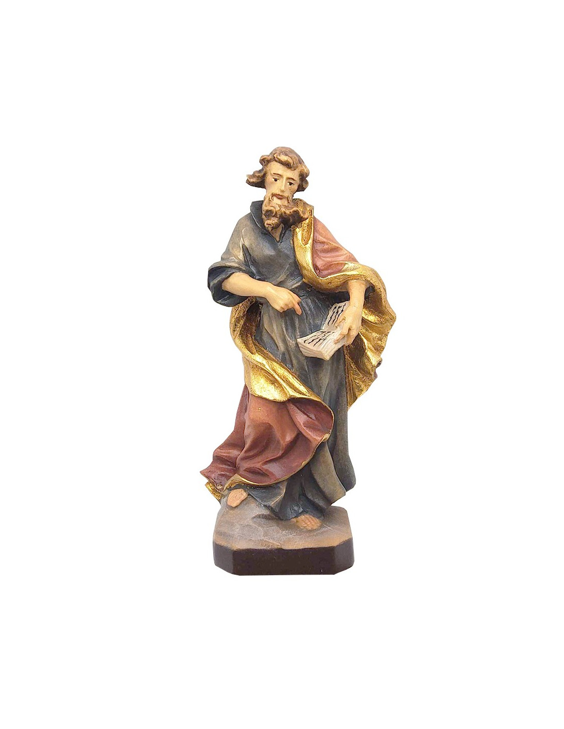 Dit handgemaakte houten beeldje van de apostel Sint Mattheüs, of Mattheüs-Levi, is gebeeldhouwd en handgeschilderd. De delicate details van dit beeldje brengen de figuur tot leven. Sint Mattheüs wordt afgebeeld in wapperende gewaden en een mantel die in de wind wappert. Hij houdt een boek in één hand, een symbool van het evangelie, waarnaar hij wijst. De binnenkant van zijn mantel is goudkleurig geschilderd, wat de kleuren van de heilige figuur versterkt.