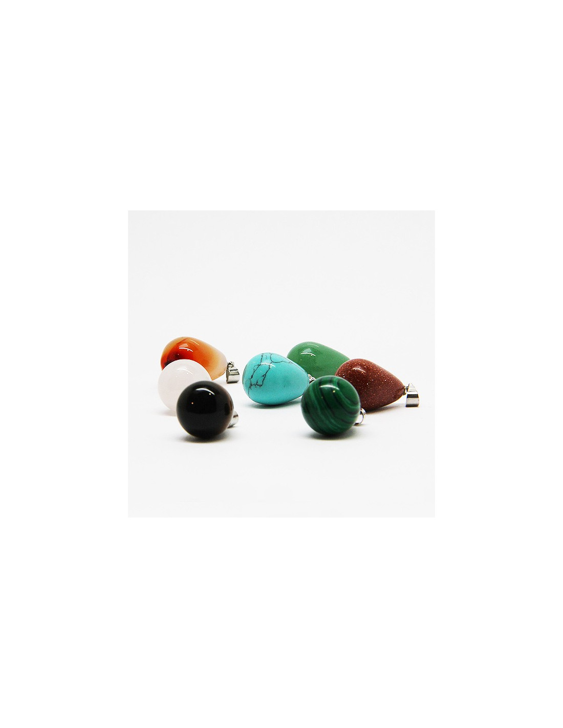 Deze ketting wordt geleverd met 7 hangers in de vorm van kleine druppeltjes. De zeven stenen zijn carneool, goudsteen, tijgeroog, synthetisch malachiet, groene aventurijn, gereconstitueerd turkoois en roze kwarts.
