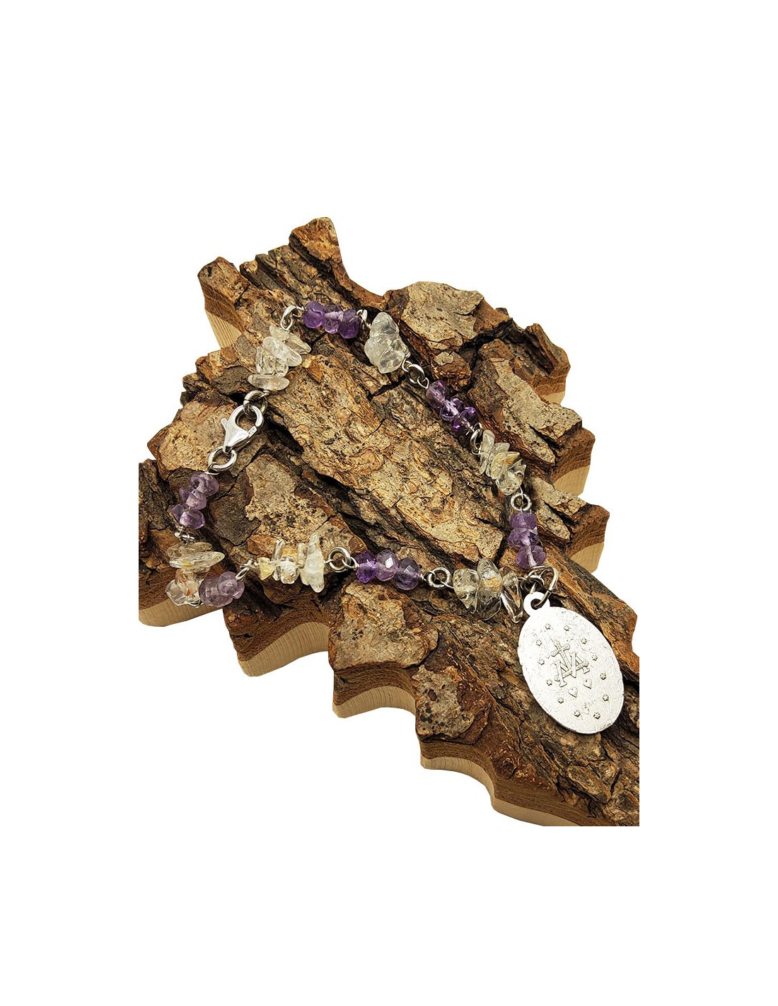 925 zilveren armband met een Wonderbaarlijke Maagd medaille, amethist en bergkristal kralen. De twee stenen zijn afwisselend geplaatst voor een prachtig patroon van kleuren en vormen. Amethist is een steen die veel wordt gebruikt in lithotherapie. De steen zendt serene golven uit die gunstig zijn voor het brengen van kalmte en het kalmeren van woede en angst. Het helpt bij het bestrijden van verslavingen (fysiek of mentaal) en bevordert de verbeelding, creativiteit en intuïtie. Het wordt ook aanbevolen voor het verlichten van hoofdpijn.