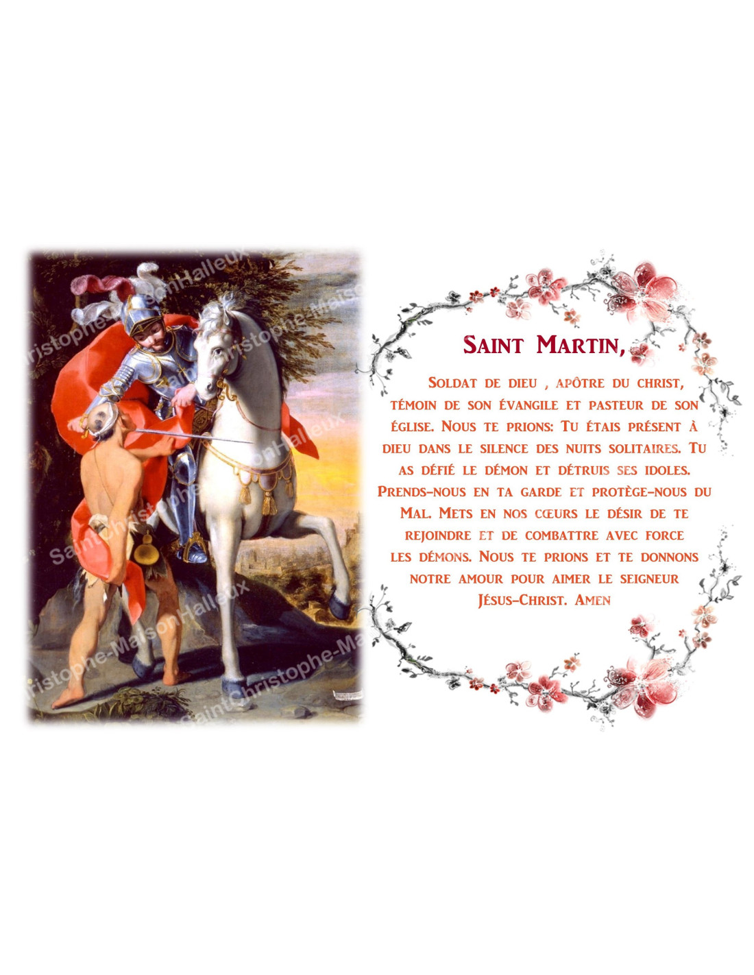 De sticker is een afbeelding van Sint-Maarten, weergegeven in de stijl van een klassieke meester, met een aan hem opgedragen gebed omgeven door een bloemenkader.