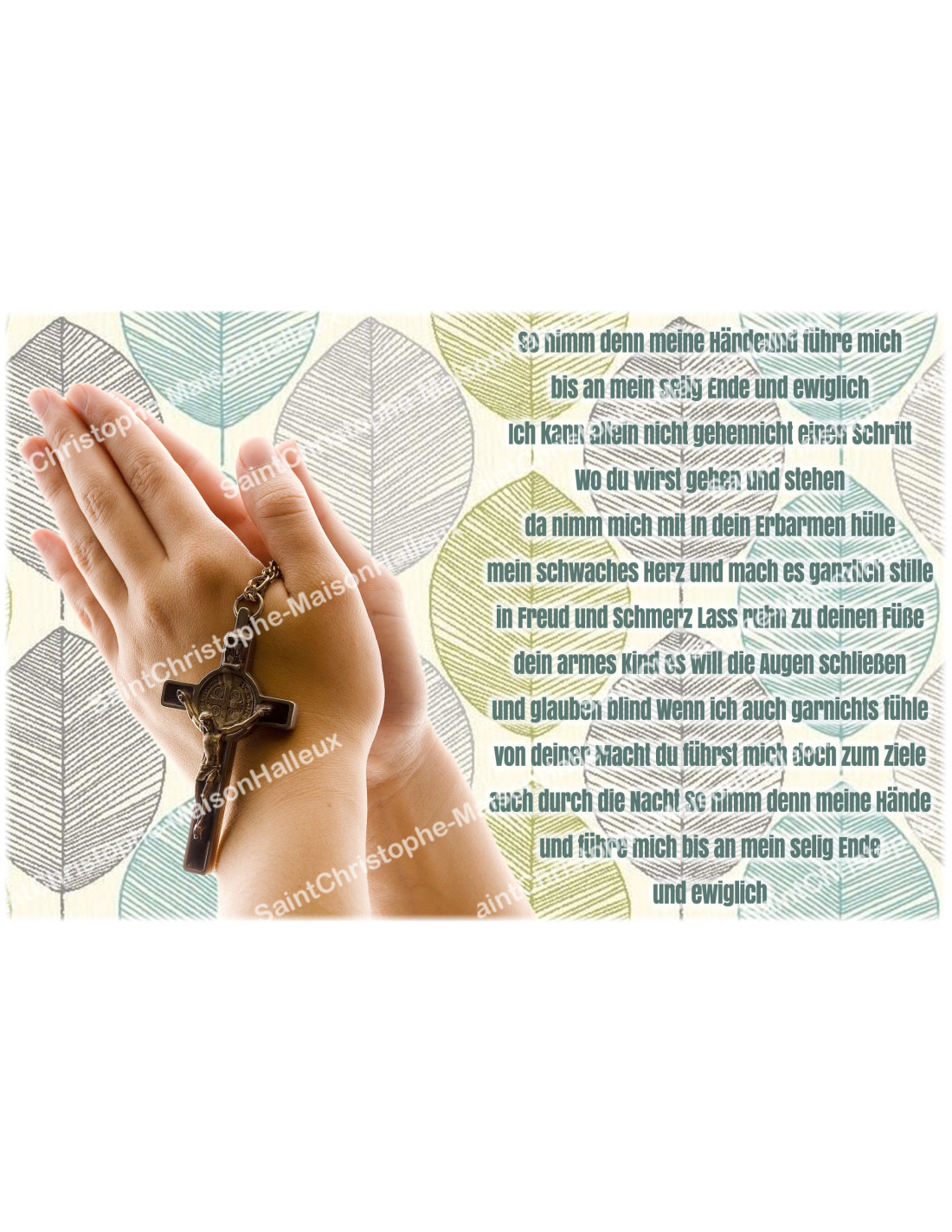 Sticker voor noveenkaars met afbeelding van gevouwen handen om te bidden en een gebed. De sticker is bedoeld voor de volledige omtrek van een kaars met een diameter van 6 cm en een hoogte van 18 cm. Deze sticker wordt aanbevolen voor witte noveenkaarsen, maar kan naar eigen smaak ook op een gekleurde kaars worden gebruikt.