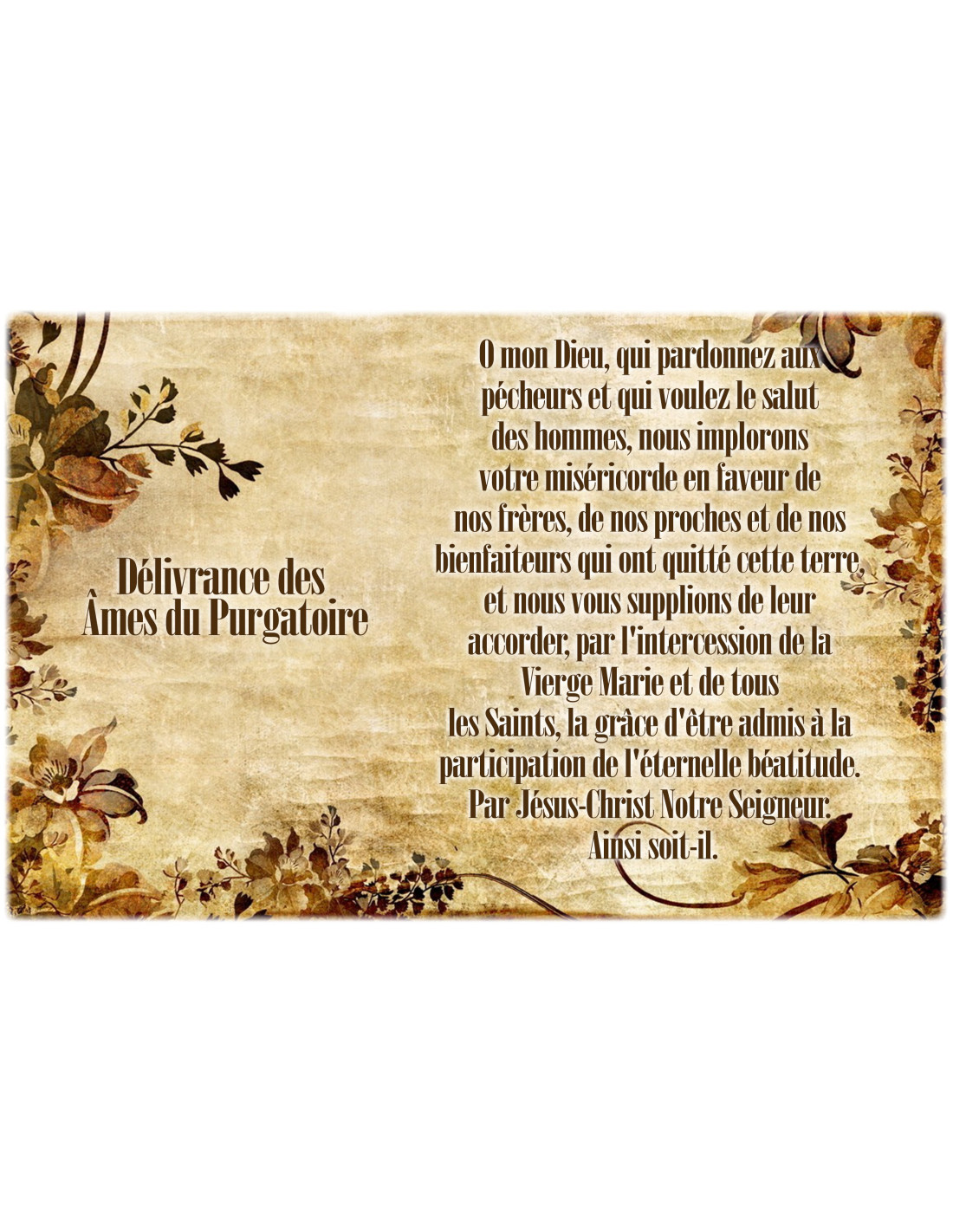 De sticker is een afbeelding van een perkament versierd met plantmotieven en een gebed gewijd aan de verlossing van de zielen in het vagevuur.