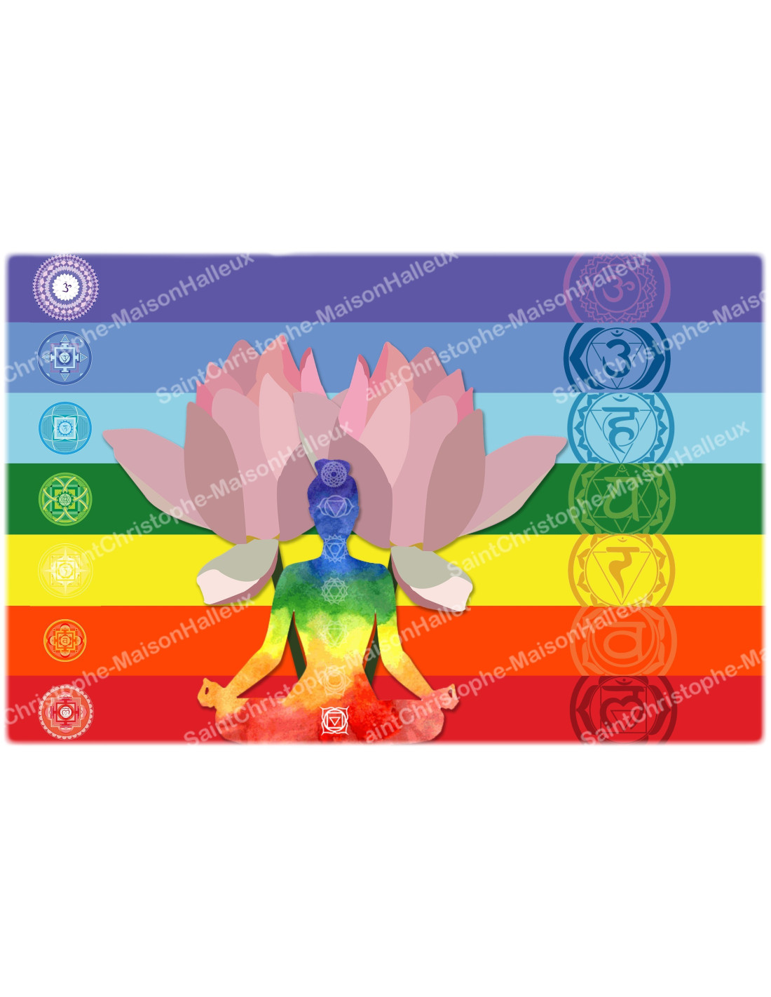 De sticker is versierd met een afbeelding in de kleuren van de regenboog en de 7 belangrijkste chakra's, met een vrouwelijk silhouet in meditatiehouding en twee lotusbloemen.