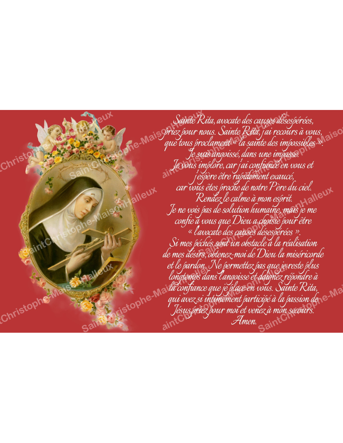 De sticker is een afbeelding van de heilige Rita, die het kruis van Jezus Christus in haar handen houdt, afgebeeld in een mooie bloemenkader met kleurrijke rozen en engelen, met een aan haar opgedragen gebed, alles op een rode achtergrond.