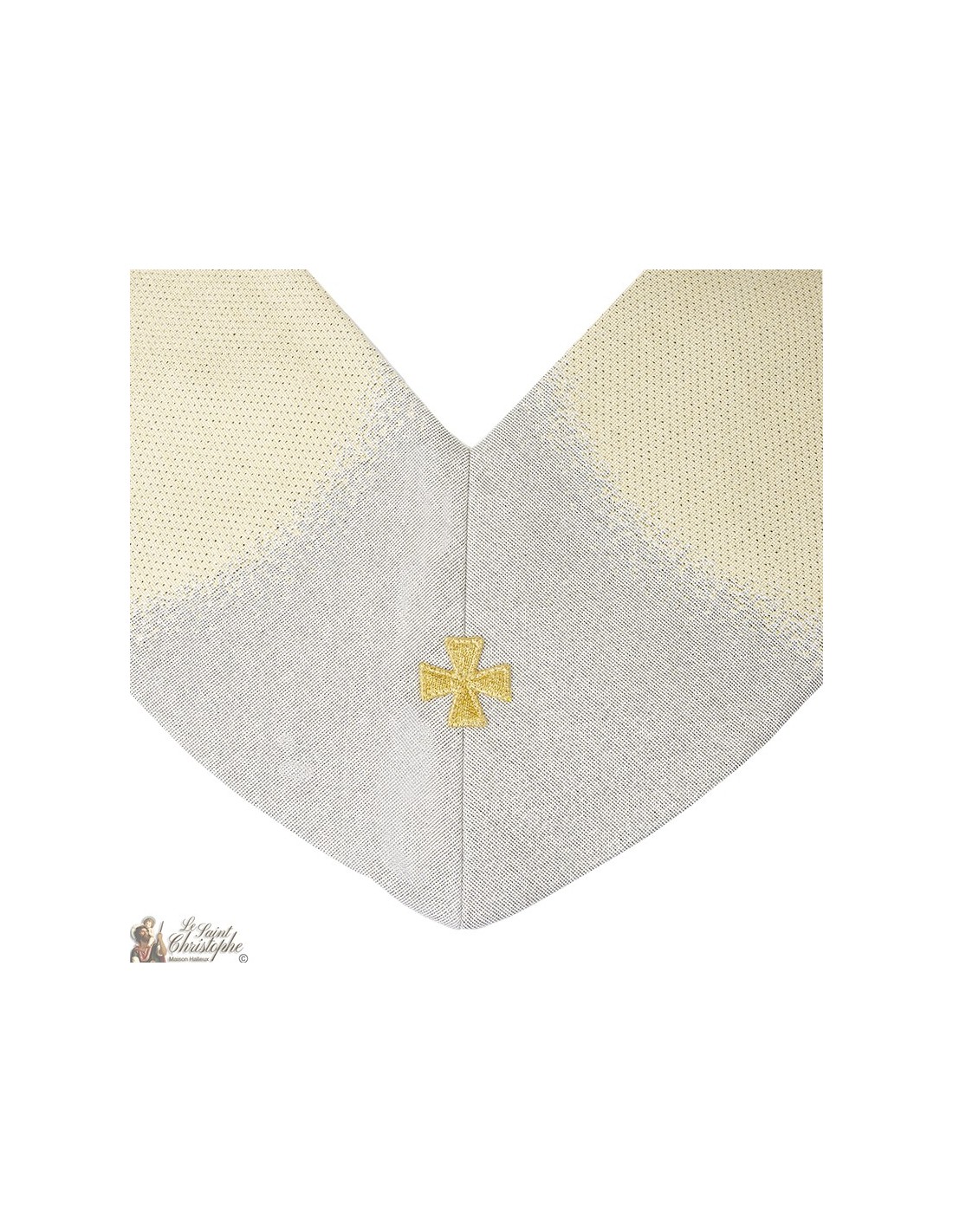 Deze priesterstola is geweven met de afbeelding van de aartsengel Sint Michiel en een kruisbloem. De crèmekleurige beige achtergrond is een delicate gradatie. Het weefsel is een echt tapisserieborduurwerk met een bewonderenswaardige afwerking, geïnspireerd op de wandtapijten van Brugge.