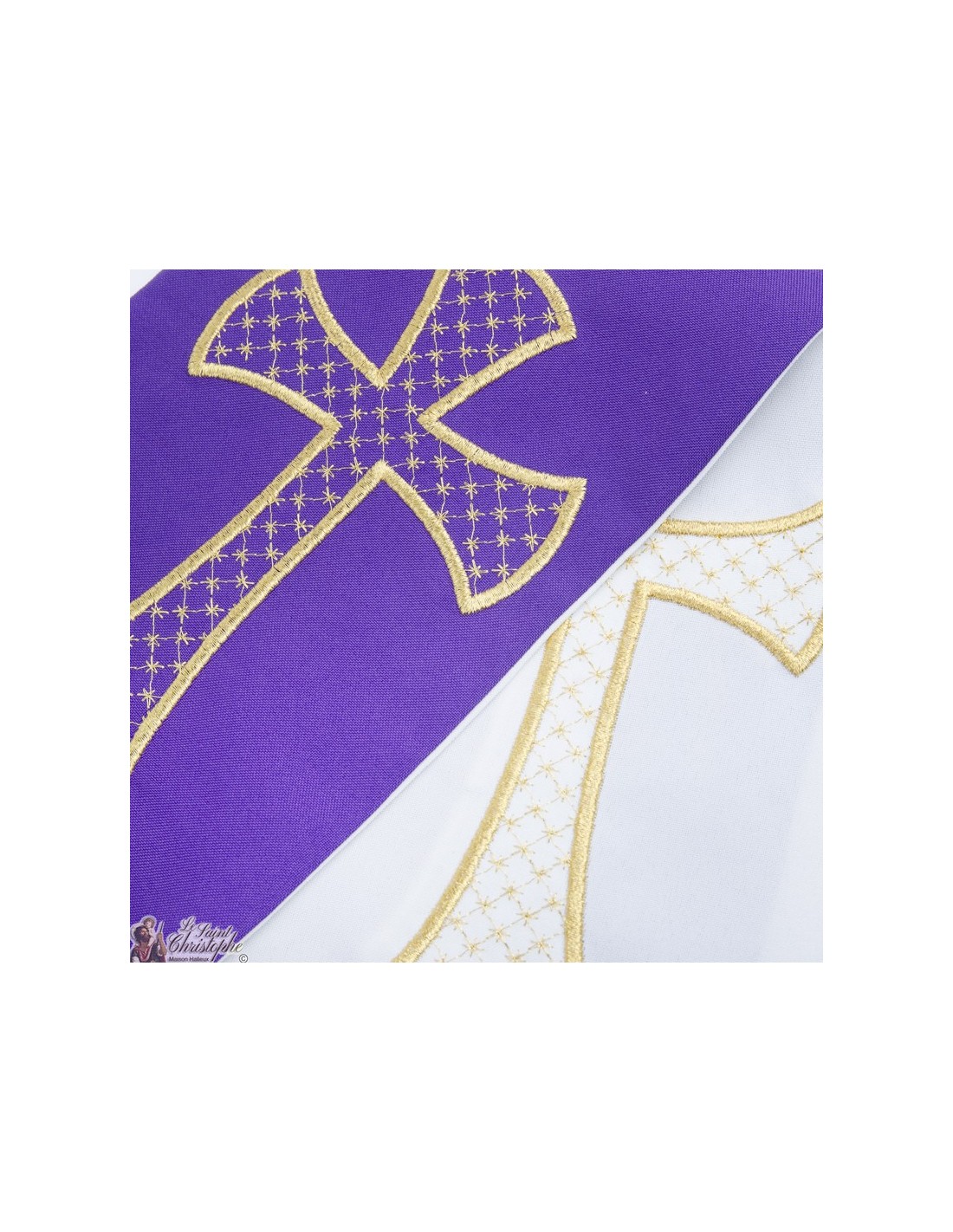 Deze tweekleurige priesterstola is dubbelzijdig of omkeerbaar. De ene kant is paars, de andere wit. Beide zijden zijn geborduurd met gouddraad, vier identieke borduursels. Het ontwerp stelt een kruis in barokstijl voor, versierd met kleine sterren in een rasterpatroon.