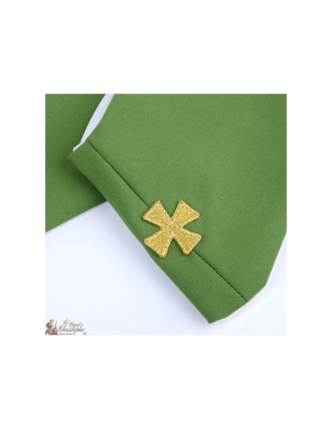 Deze tweekleurige priesterstola is dubbelzijdig of omkeerbaar. De ene kant is wit, de andere groen. Beide zijden zijn geborduurd met gouddraad, vier identieke borduursels. Het ontwerp stelt een kruis voor in een moderne en eenvoudige stijl.