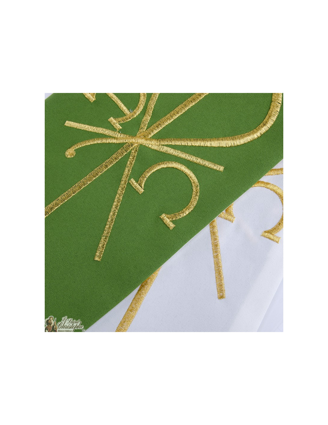 Deze tweekleurige priesterstola is dubbelzijdig of omkeerbaar. De ene kant is wit, de andere groen. Beide zijden zijn geborduurd met gouddraad, vier identieke borduursels. Het patroon stelt het PAX alfa en omega symbool voor.