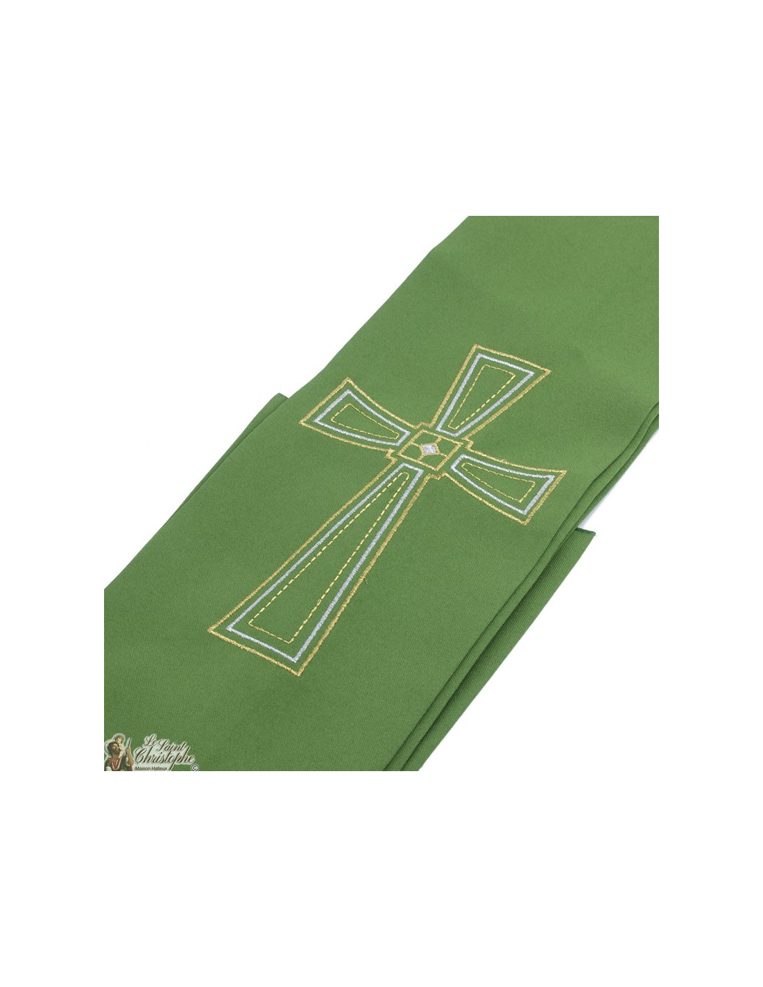 Groen geborduurde priester stola. De stola is volledig met de hand gemaakt, gemakkelijk in onderhoud en machinewasbaar. Het borduurwerk is uitgevoerd in goud- en zilverdraad en stelt een imposant en geometrisch kruis voor.