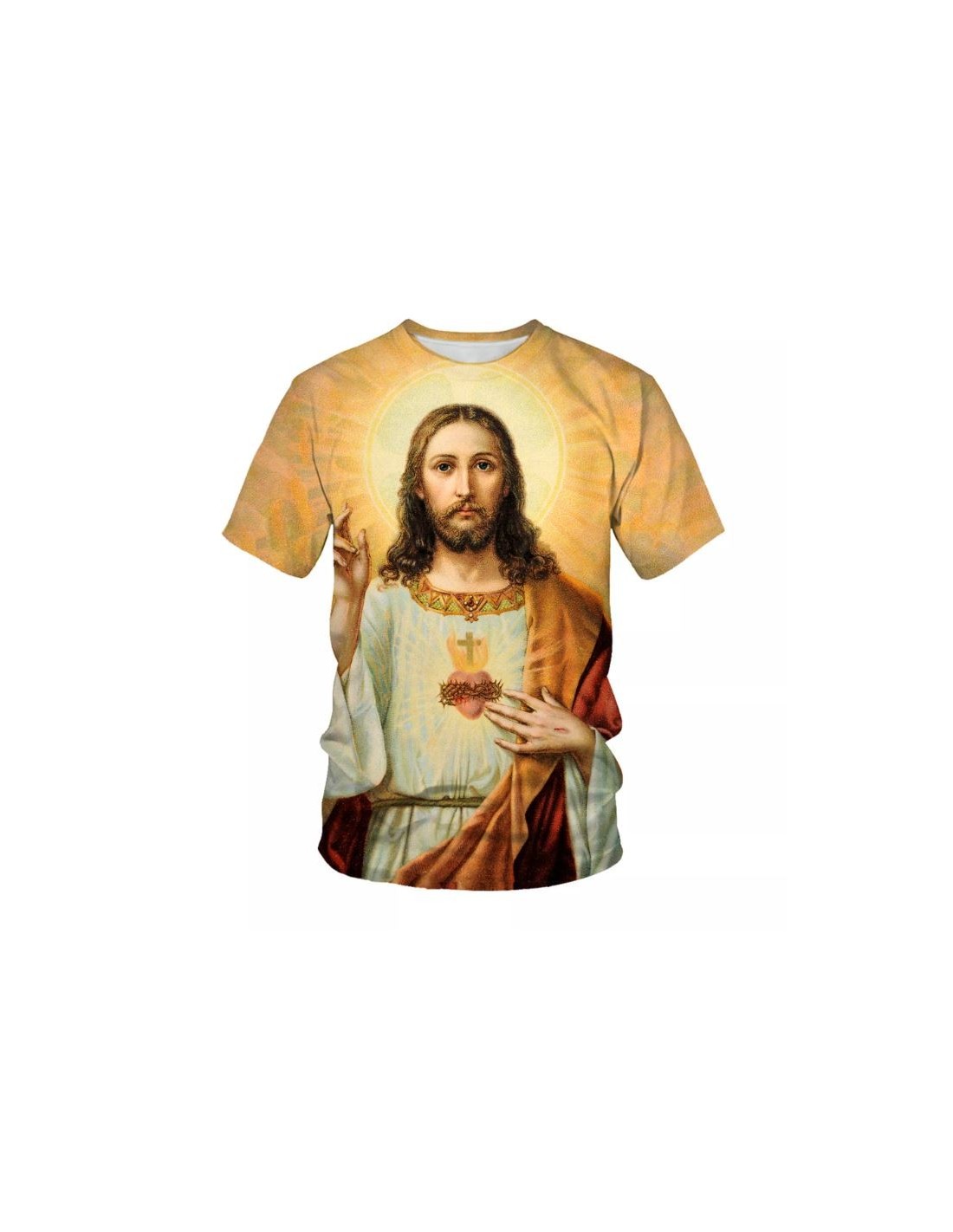 T-shirt met het Heilig Hart van Jezus op een zeer intense okergele hemelachtergrond. De print is felgekleurd. Het materiaal is zeer licht en doet denken aan de zeer luchtige sportjacks en tunieken. Een ideaal kledingstuk om de huid te laten ademen op warme dagen.