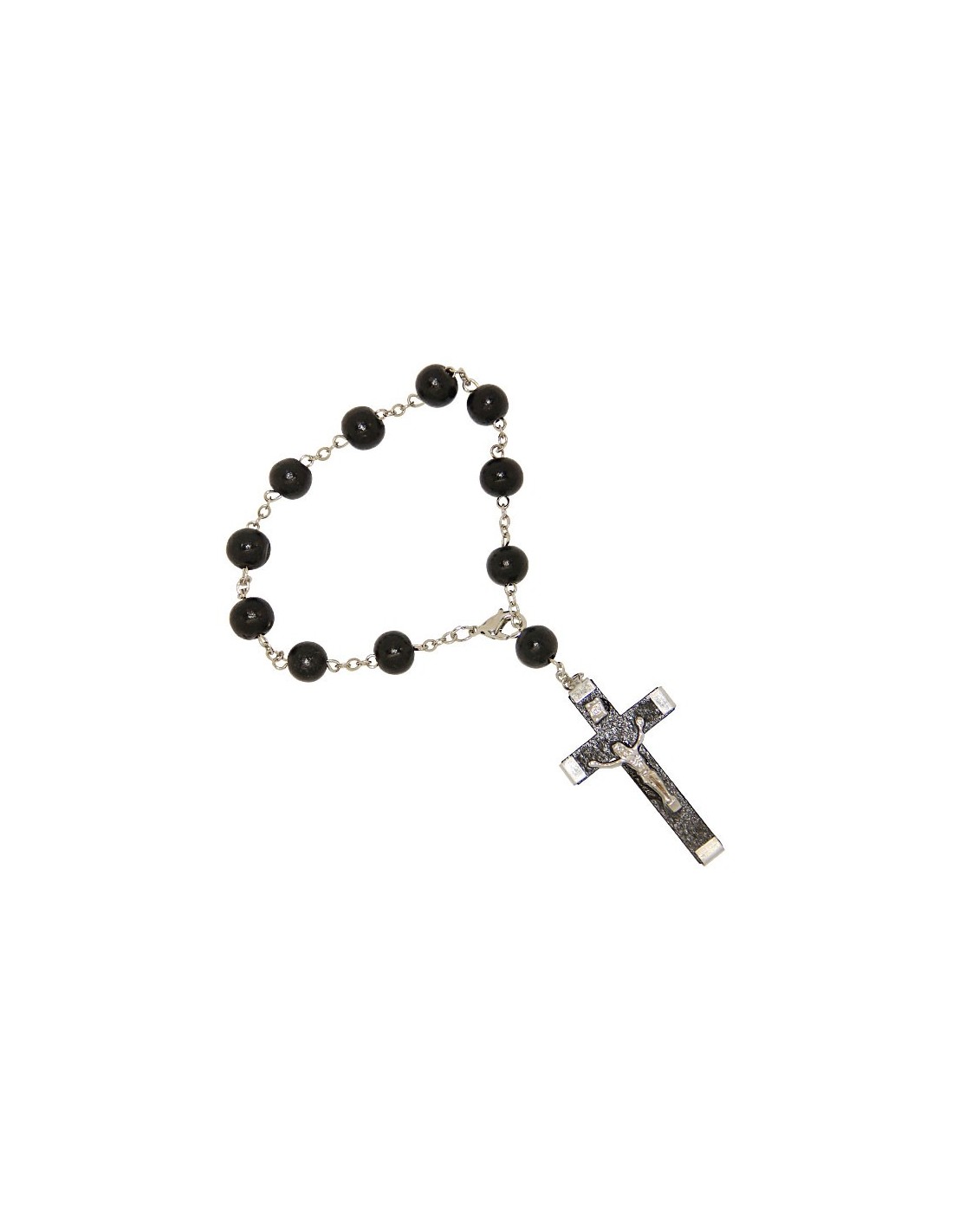 Kleine rozenkrans, ook wel dozijnrozenkrans of rozenkrans met tien kralen genoemd, met zwarte houten kralen en zilvergrijze metalen ketting met karabijnsluiting. Door zijn lengte kan hij als armband gedragen worden. Het kruis, een grote hanger, is gemaakt van hout omcirkeld in metaal met Christus en het INRI-perkament in zilver.