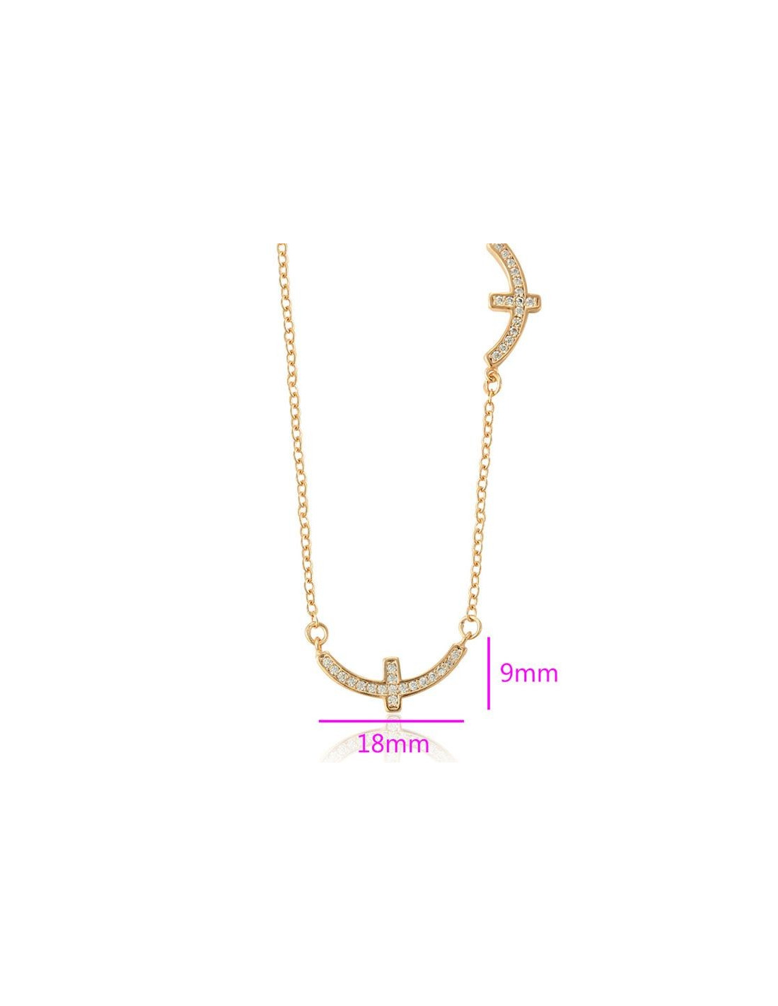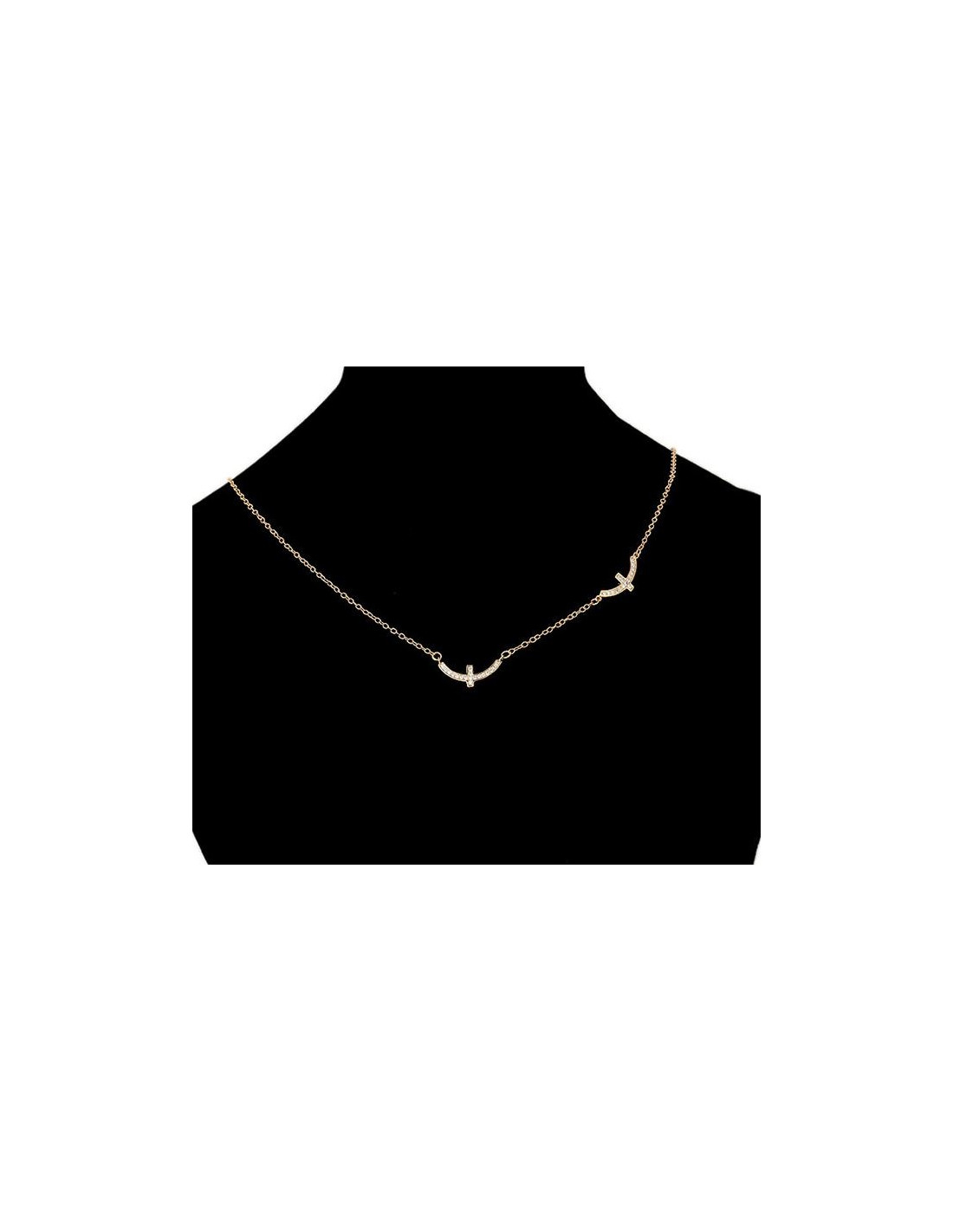 18 karaats vergulde koperen ketting met twee hangers. De hangers zijn twee kruizen, geïntegreerd in de keten. Ze zijn ingelegd met synthetische Swarovski (CZ) kristallen. De kruizen zijn gebogen om een mooi trendy effect te geven.