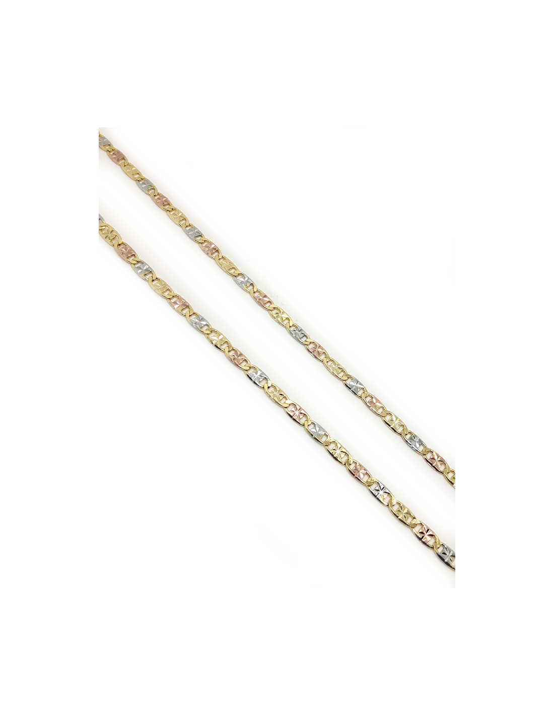 Voeg een vleugje luxe en elegantie toe aan uw stijl met deze prachtige gelamineerde ketting met driekleurig motief in verguld roestvrij staal. Deze stralende en verfijnde ketting is ontworpen om langdurig te glanzen en niet te verkleuren. Het is een tijdloos sieraad dat bij al uw outfits past. Dankzij de hoge kwaliteit is de ketting zelfs waterbestendig en verkleurt hij niet. De schakels zijn gerangschikt in een afwisselend patroon van zilver, goud en roségoud voor een prachtig glanzend effect.
