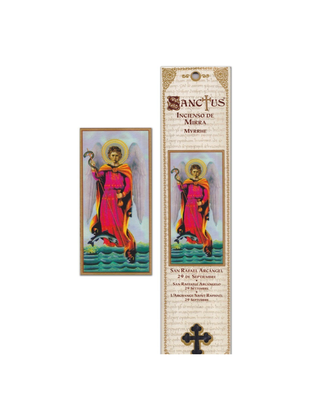 Dit zakje, met de beeltenis van de aartsengel Sint Raphaël, in heldere kleuren, bevat 15 stokjes natuurlijke wierook, delicaat geparfumeerd met mirre. Het wordt voornamelijk gebeden op 29 september. Deze bijzondere geur in verband met de aartsengel maakt deze wierook tot een hulpmiddel bij genezing. Het versterkt de dynamiek en helpt om sneller weer op de been te komen. Het wordt aanbevolen tijdens meditaties of gebeden voor een betere concentratie en spirituele begeleiding van de Aartsengel. Deze wierook wordt ook gebruikt om je open te stellen voor mededogen en Onvoorwaardelijke Liefde, en om een zielsverwant te vinden.