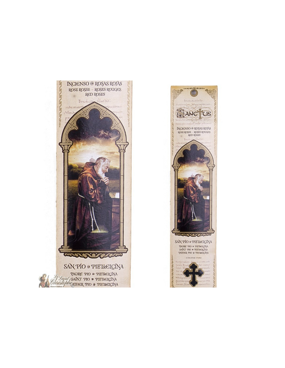 Dit zakje, met de beeltenis van Pater Pio, biddend voor een altaar, bevat 15 stokjes natuurlijke wierook geparfumeerd met rode roos. Deze wierook, een uitstekende combinatie van parfum en de gekozen heilige, wordt aanbevolen om te bidden tot de zielen in het vagevuur en om vooruit te blijven gaan ondanks de stormen die soms op ons leven vallen. Het geeft kracht en moed, en stelt ons in staat in onszelf de nodige middelen te vinden om de uitdagingen van het dagelijks leven te overwinnen. Naast de energie die in ons verborgen zit, helpt het ons ook om hulp van buitenaf te krijgen wanneer dat nodig is.