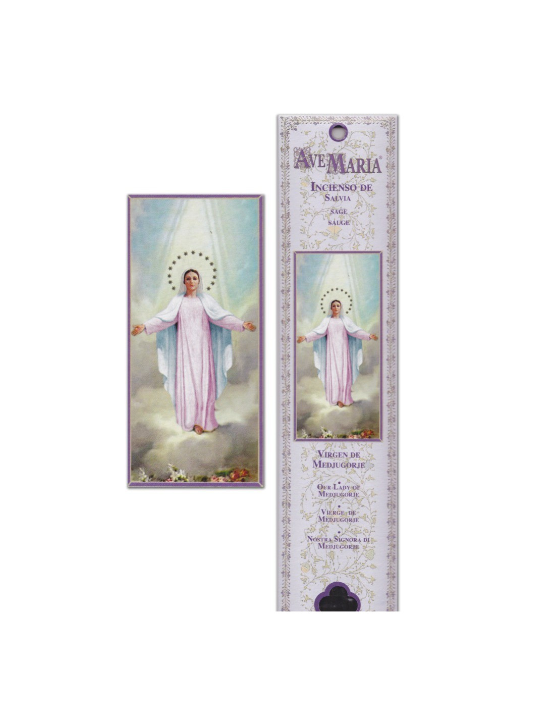 Dit zakje, met de beeltenis van de Maagd van Medjugorje, met zijn zachte en heldere kleuren, bevat 15 stokjes natuurlijke wierook met de zuiverende geur van salie. Deze wierook, die de deugden van Onze Lieve Vrouw en salie combineert, is een krachtige zuiveraar die schadelijke en negatieve energieën verdrijft om vrede te brengen in je omgeving. Het wordt ook aanbevolen om een serene en kalme atmosfeer te creëren, om spanning en andere angsten te verlichten.