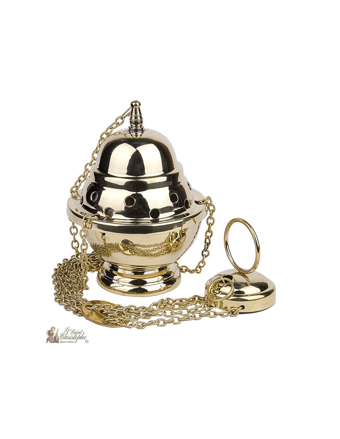 Deze vergulde koperen wierookbrander schittert! Hij is volledig met de hand gemaakt en dankzij zijn praktische ontwerp kan hij met kettingen worden opgehangen. In de wierookbrander zit houtskool en in het binnenbakje kunt u de wierook er gemakkelijk in doen.